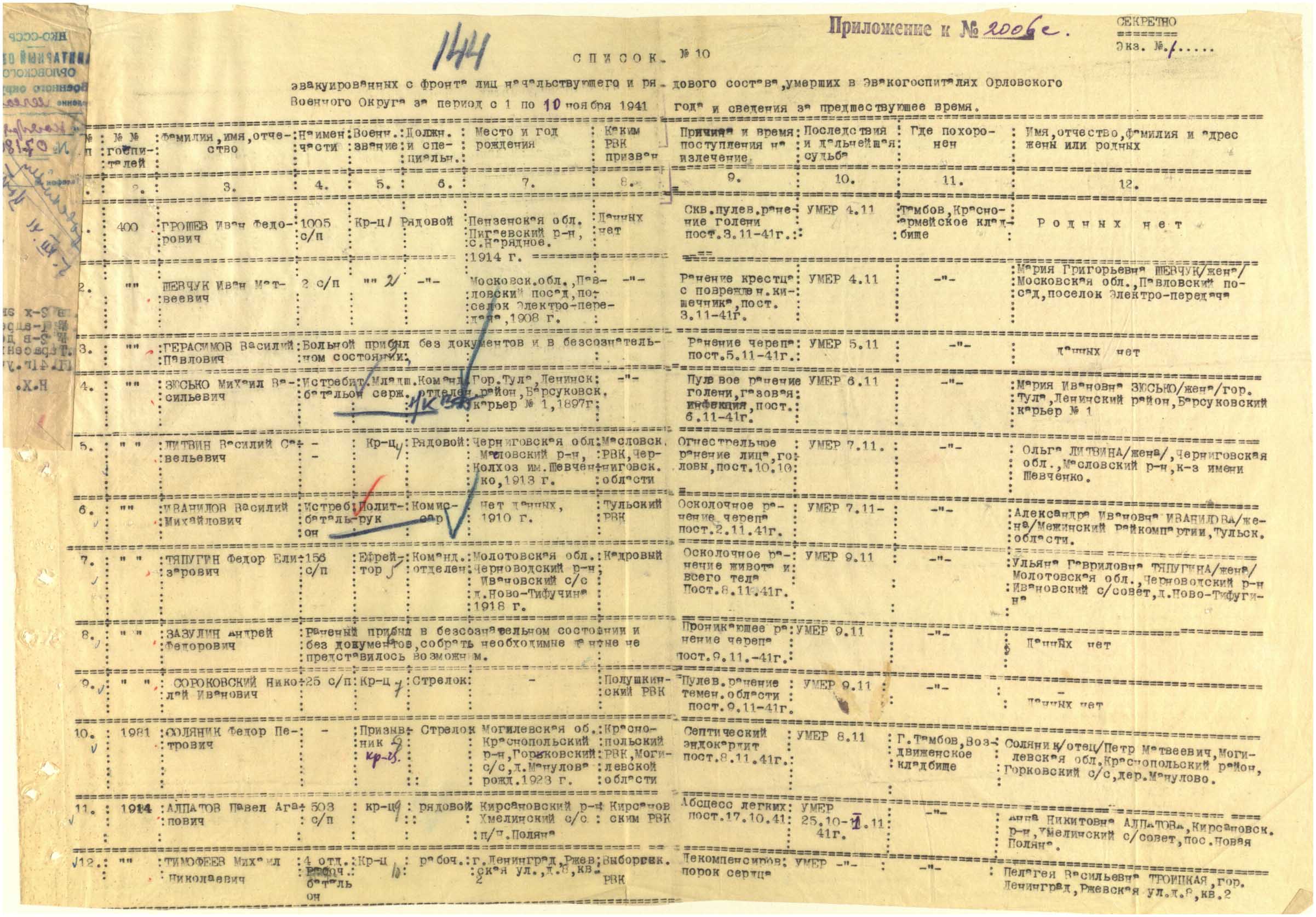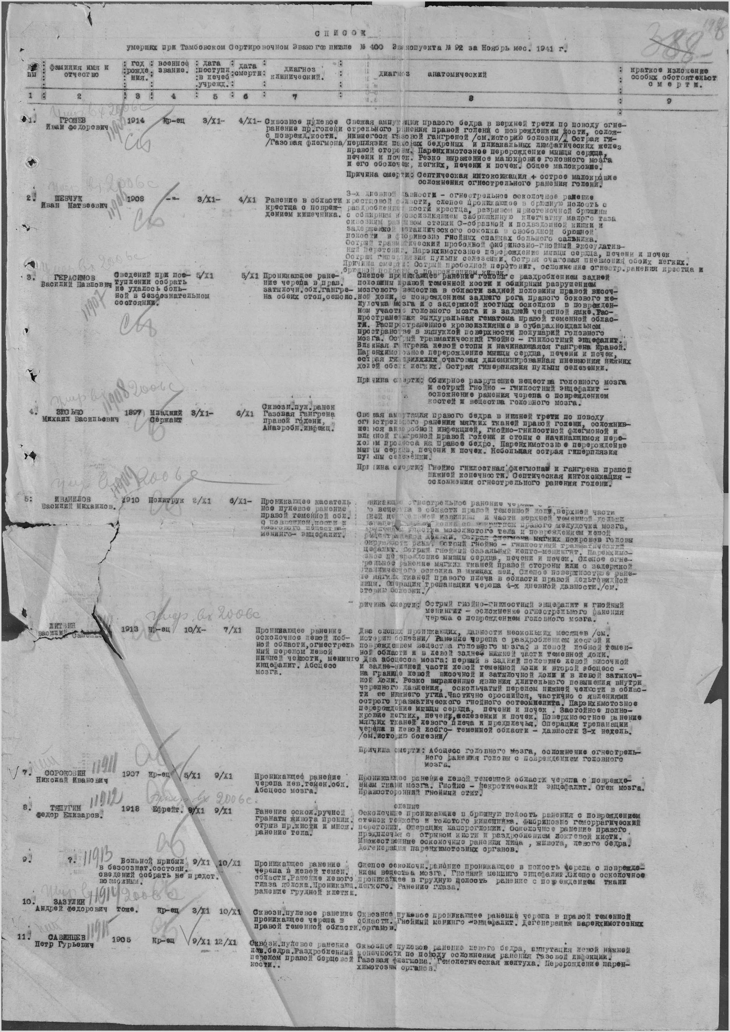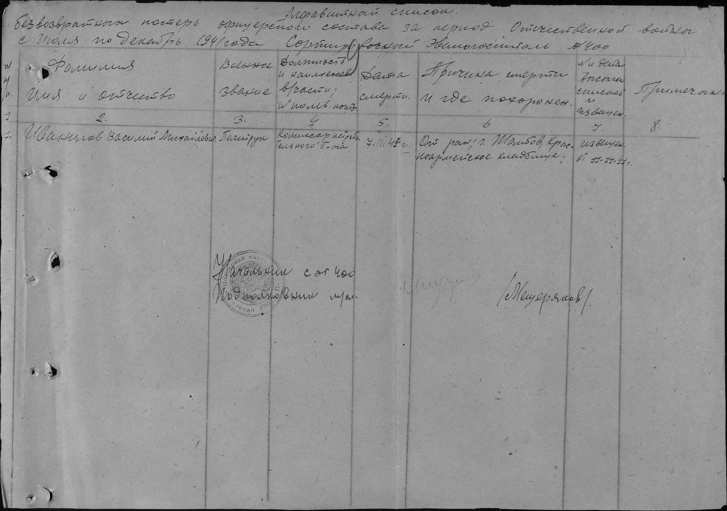Есть все основания считать, что политрук, комиссар батальона Иванилов Василий Иванович был ранен в первом бою ТРП в районе Рогожинского поселка 30.10.1941 (возможно, и позже, в другом бою - согласно данным ОБД, 02.11.1941 г., см. ниже). Из воспоминаний бабушки Матвея (со слов свидетелей)- Василия Матвеевича оперировали в областной больнице г. Тула. Бойцов с тяжелейшими ранениями - Иванилова В.М., Зюсько М.В.(бойца того же истребительного батальона) эвакуировали в г.Тамбов в один из госпиталей Орловского военного округа, где он и умер 07.11.1941. Правда, в разных документах разные даты смерти с разницей в один день. Для документального подтверждения этой легенды родственники Иванилова сделают запрос в Архив Военно-медицинского музея. Прикрепленные файлы: