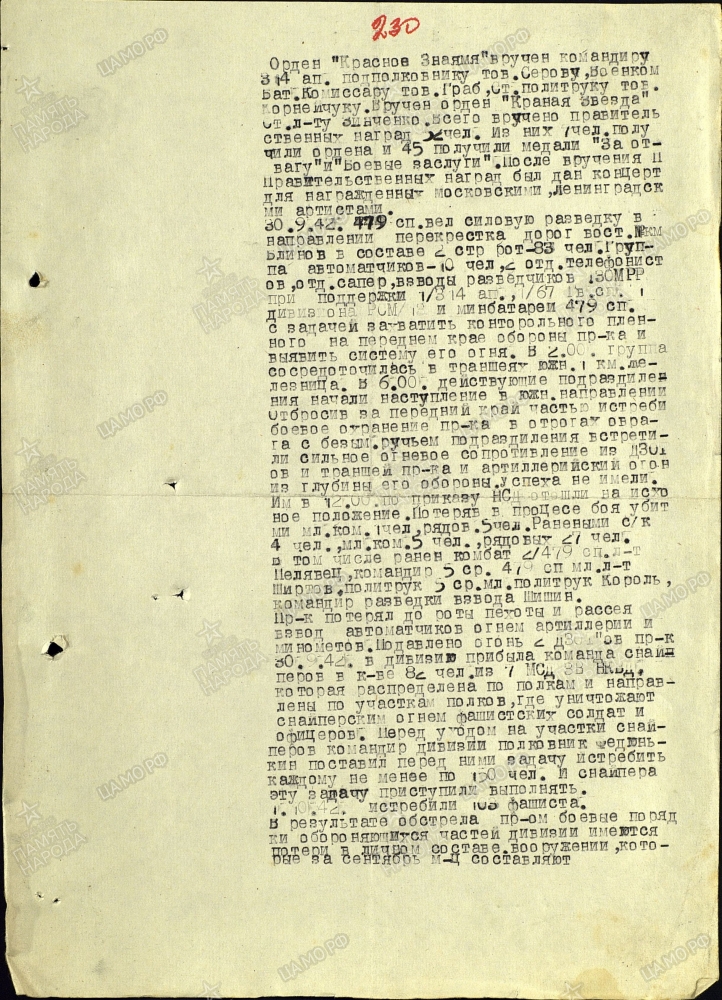 Здравствуйте, Игорь! Упоминание, что дивизион РС принимал участие в силовой разведке в ЖБД 61 А за 30.09.42 г. отражено только по 479 СП 149 СД. Есть единичное упоминание, что при проведении силовой разведки 356 СД в начале операции их поддержали огнем РС. Такая поддержка могла производиться только на расстоянии и нет упоминания о непосредственном участии дивизиона РС в боевой операции. Прикреплю только скан, где упоминается 479 СП. Остальные посмотрите, пожалуйста, сами по ссылке https://pamyatnaroda.mil.ru/jbd/110073204/. Если просмотреть ЖБД 149 СД за более ранние периоды, то найдете информацию о поступлении РС в дивизию. К сожалению, не помню точную дату. Ссылка есть в предыдущем сообщении. Возможное место захоронения может быть вместе с бойцами 479 СП в районе д. Железницы Ульяновского района Калужской области. По Донесениям о безвозвратных потерях 479 СП захоронения производились в этом районе, в том числе и бойцов, погибших 30.09.42 г. Ссылка на Донесение https://obd-memorial.ru/html/info.htm?id=50995329&page=1 Прикрепленные файлы: