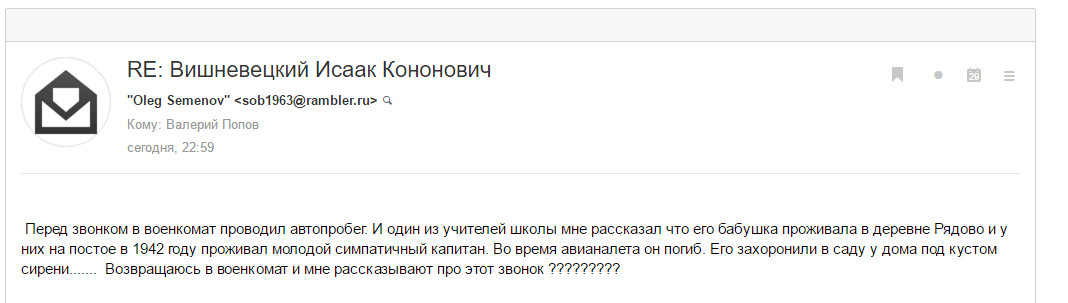 Коллеги. Мистический случай произошел у Олега Семенова с тем, что связано с капитаном Вишневецким. Игорь звонил ему в тот же день, в которой внук жительницы деревни Рядово рассказывал о нем же. О капитане Виневцком Исааке Кононовиче. Привожу письмо Олега Семенова "без купюр". Прикрепленные файлы: