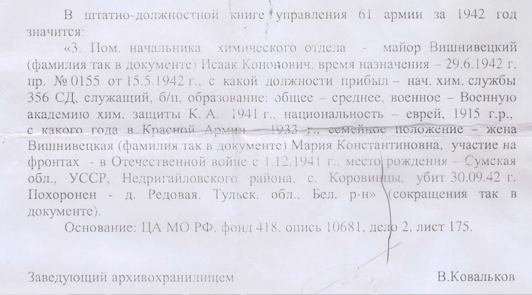 Игорь, РС, так написано в ЖБД. По поводу донесений, он ведь учтен погибшим 30.09.42 г. на ОБД дважды. Первую ссылку привел Валерий. Второй раз в Послевоенном донесении Северо-Кавказкого военного округа от 47 г.( возможно после расформирования 61 Армии в 45 г. документы были переданы туда?). Фамилия искажена, записан как ВишнИвецкий. Фамилия Вишнивецкий Имя Исаак Отчество Кононович Воинское звание майор Причина выбытия убит Дата выбытия 30.09.1942 https://www.obd-memorial.ru/html/info.htm?id=75114367 В сопроводительном письме к Донесению указано, что передаются карточки и список. Вы видели эту карточку в ЦАМО? Хотя, количество передаваемых карточек меньше на 2, чем список офицеров. По поводу увековечивания, лучше Валерия никто не проконсультирует. https://www.obd-memorial.ru/html/info.htm?id=75114189&page=1 По Конону Борисовичу напишу чуть позднее. | ||||