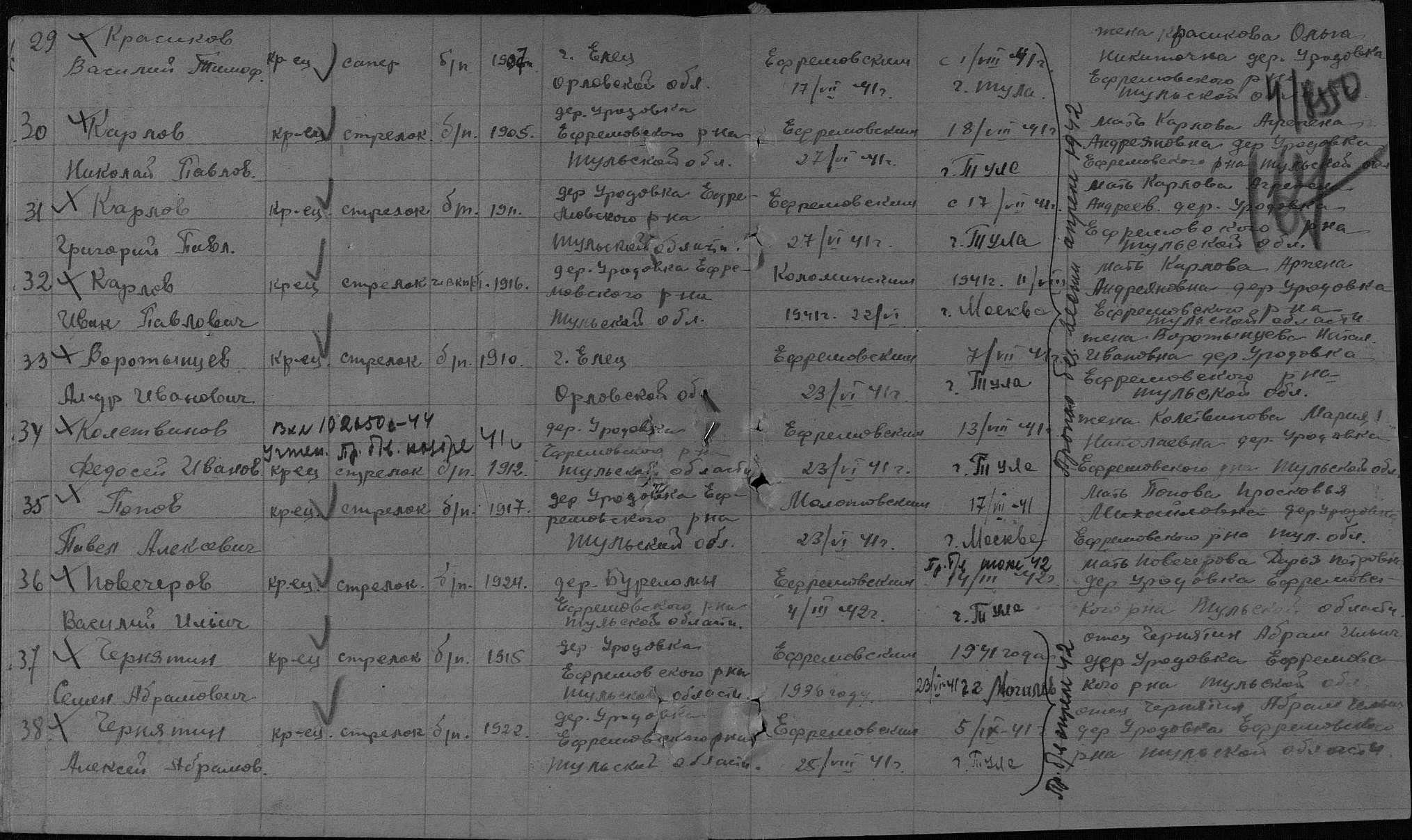 В списках захороненных в Тульской обл. Повечеров не числится. Можно еще по ОБД пройтись "поиграв" с фамилией (меняя буквы), бывает часто, что записывали с ошибками. Далее, набрать в ОБД призыв Ефремовского РВК на период март. Просмотреть, кто призывался с ним, посмотреть на них донесения. Как правило, земляков отправляли в одну часть. Еще, написать в Ефремовский РВК на предмет определения, куда был призван. | ||||