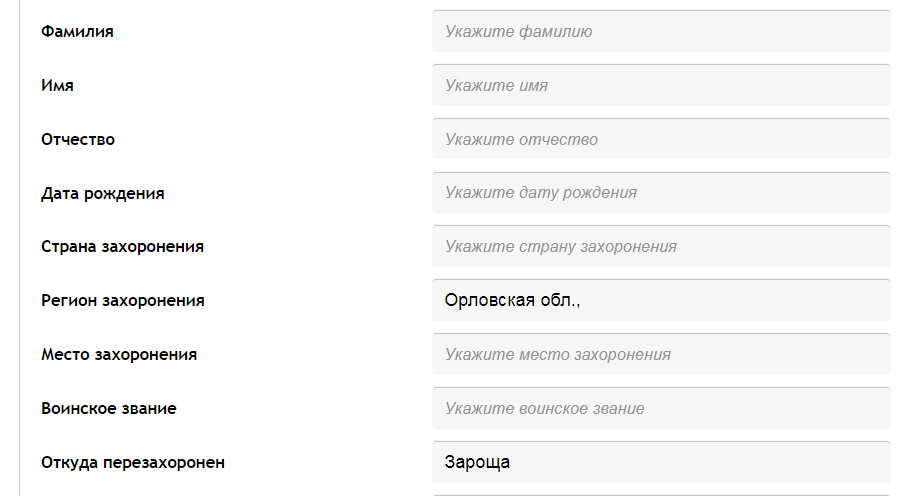 Вам надо 1. В ОБД Мемориал оставить галочку возле обелиска ( В поименных списках захоронений ) 2. В графе Регион захоронения написать Орловская обл., 3. В графе Откуда перезахоронен написать Зароща 4. Нажать кнопку "Искать" В результате у Вас "выкатится 6 листов. Вероятно, что там будут воины из нескольких могил. Начинается этот список в 6 листах с могилы в самой Зароще. Листайте эти 6 листов. Пункты 2 и 3 отражены на прикрепленном файле. Еще надо добавить, что воин не увековечен, но его увековечивание входит в компетенцию Мценского РВК, Орловской области. Тульские РВК тут бессильны. Прикрепленные файлы: