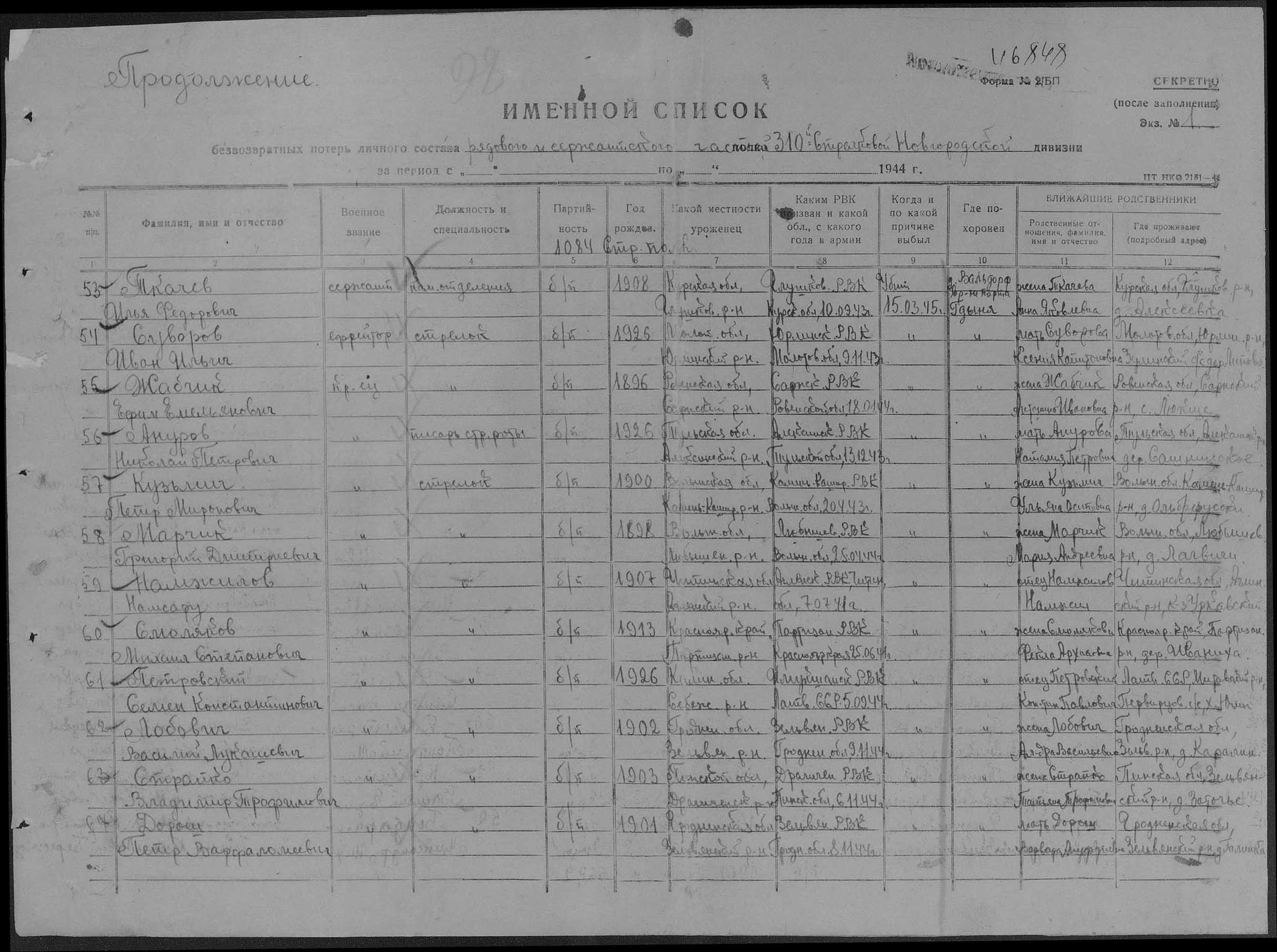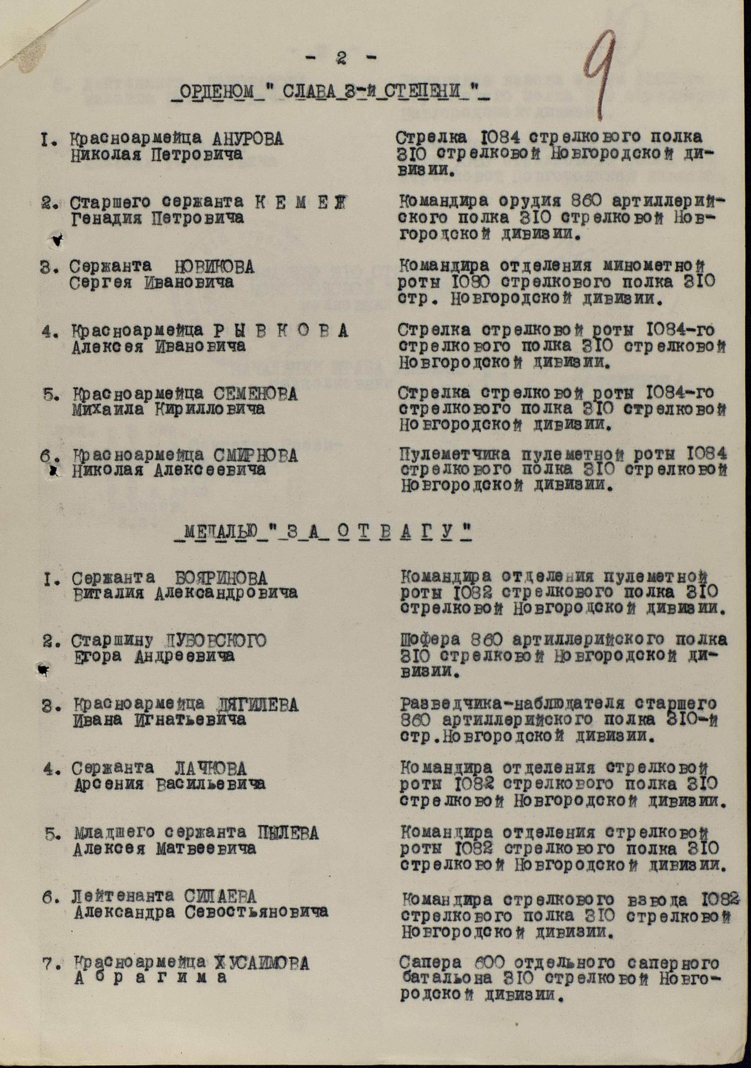 У Анурова Акма был брат Николай который в армию призвался Алексинским РВК.Тульской обл.13.12.43г. в адресе семьи указано уже не дер. Мясоедово а дер.Сашкинская в Алексинском районе названия с такой деревней нет,но есть дер. Сашкино,сейчас это Ферзиковский р-н Калужской обл. Также указана только мать Наталья Петровна.Будем искать в этом направлении. Николай Петрович служил писарем стрелковой части 310 СП ,но это уже после тяжёлого ранения . Так же он был награждён орденом Славы 3 степени. Вот описание подвига из наградного листа. 7.07.1944г. во время боевой операции по оседланию шоссейной дороги,у станции Лаймола, Карело-Финской ССР,когда противник с целью вернуть захваченный нами участок,8 раз переходил в яростные контр-атаки,отбитые с большими потерями .т.Ануров уничтожил в этом бою,огнём из своего автомата 12 финских солдат,воодушевляя своим мужеством остальных бойцов по уничтожению противника и содействуя успеху выполнения боевого задания. В этом бою т. Ануров получил тяжёлое ранение потеряв правый глаз. Взято: ОБД "Мемориал" и " Подвиг Народа " Прикрепленные файлы: