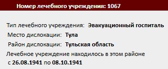 Формулировка Захоронен в Туле на кладбище. Умер от ран 10.08.1943. Московская область, Ногинский район, город Ногинск, улица Коммунистическая, дом 172
