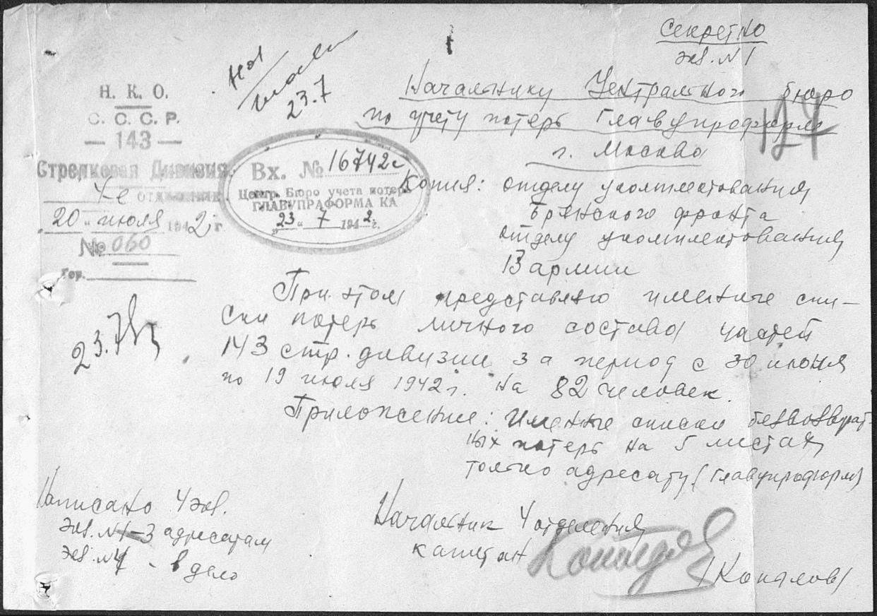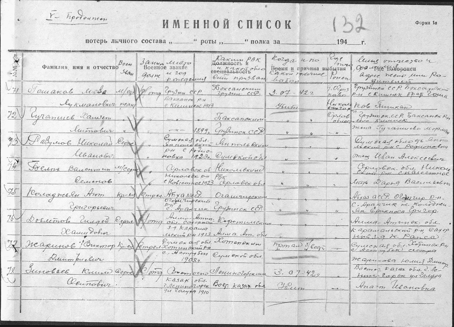 Марина Фандеева: Доброго времени суток, Марина! К сожалению, ваша ситуация - далеко не редкость. Ливенская администрация дала вам такой ответ на основании того, что в именных захоронениях района ваш дед не числится, то есть его нет в учётной карточке ни одной братской могилы. Здравствуйте,мы Вам писали сообщение о нашем дедушке Латышев Павел Ефремович. Нам пришло много ответов за что очень благодарны,но мы тоже вели поиски сами и нашли в ОБД Мемориал две записи. В одной записи пропал без вести в июне 1942 года,а в другой записи убит в июле 1942 года похоронен в деревне Огрызково Орловской области Ливенского района. Мы ездили на место захоронения,делали запросы в Ливенскую администрацию,нам ответили,что в Ливенском районе он не числится.С области никаких данных не дают.Но местные жители нам объяснили,что это место находится на стыке трех областей и документы по его захоронению могли попасть в Курскую или Липецкую области.Не могли бы Вы проверить эту информацию у нас ничего не получается.Большое спасибо. Вместе с вашим дедом в Огрызково погибли и захоронены 28 бойцов. 26, включая вашего деда, ни в одной братской могиле Ливенского района не значатся. Лишь двое увековечены: Информация из донесения о безвозвратных потерях Фамилия Белых Имя Валентин Отчество Семенович Дата рождения/Возраст __.__.1923 Место рождения Орловская обл., Никольский р-н, с. Новестное Дата и место призыва Никольский РВК, Орловская обл., Никольский р-н Последнее место службы 143 сд Воинское звание мл. сержант Причина выбытия убит Дата выбытия 03.07.1942 Название источника информации ЦАМО Номер фонда источника информации 58 Номер описи источника информации 818883 Номер дела источника информации 1004 Захоронен в Огрызково Информация из списков захоронения Фамилия Белых Имя Валентин Отчество Семенович Дата рождения/Возраст __.__.1923 Воинское звание рядовой Дата смерти 03.07.1942 Страна захоронения Россия Регион захоронения Орловская обл. Место захоронения Ливенский р-н, с. Норовка Могила Братская могила № 42 Информация из донесения о безвозвратных потерях Фамилия Плакса Имя Степан Отчество Васильевич Дата рождения/Возраст __.__.1906 Место рождения Каменец-Подольская обл., Полонинский р-н, с. Мондан Вальяна Дата и место призыва Полонский РВК, Украинская ССР, Каменец-Подольская обл., Полонский р-н Последнее место службы 143 сд Воинское звание красноармеец Причина выбытия убит Дата выбытия 02.07.1942 Название источника информации ЦАМО Номер фонда источника информации 58 Номер описи источника информации 818883 Номер дела источника информации 1004 Захоронен в д. Огрызково Информация из списков захоронения Фамилия Плакса Имя Степан Отчество Васильевич Воинское звание рядовой Дата смерти 03.07.1942 Страна захоронения Россия Регион захоронения Орловская обл. Место захоронения Ливенский р-н, с. Норовка Могила Братская могила № 42 У нескольких бойцов упомянуто место захоронения в Книгах памяти: Информация из Книги Памяти Фамилия МАКРУШИН Имя Василий Отчество Михайлович Дата рождения/Возраст __.__.1922 Дата выбытия 03.07.1942 Название источника информации Книга памяти. Кировская область. Том 4 Захоронен д. Огрызково Орловской области Информация из Книги Памяти Фамилия ФАСХЕЕВ Имя Иман Отчество Сулейманович Дата рождения/Возраст __.__.1923 Дата выбытия 02.07.1942 Название источника информации Книга памяти. Калужская область. То