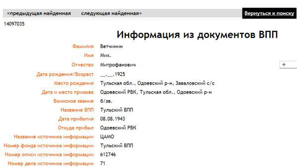 Вот ссылка на страницу из ОБД на Михаила Ветчинина: http://www.obd-memorial.ru/memorial/imagelink?path=f538e4c7-4dbb-4428-9480-9d0cd82d17de | ||||