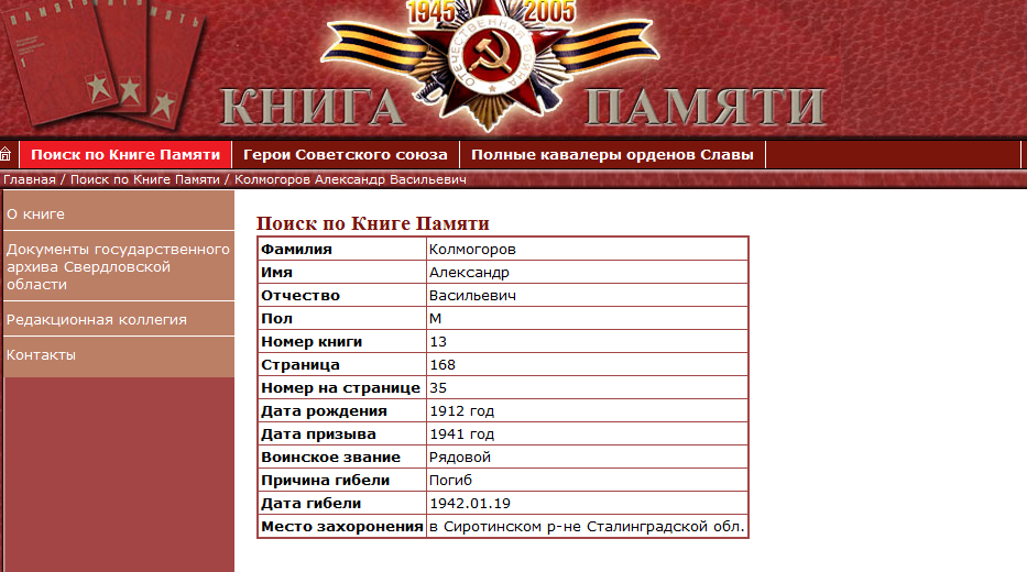 Я связался по телефону с Инной и выяснил что правильно надо искать по такой вот записи Колмогоров Алексей Васильевич 1912 года рождения. За помощью для розыска захоронения я обратился к Волгоградским поисковикам. Прикрепленные файлы: