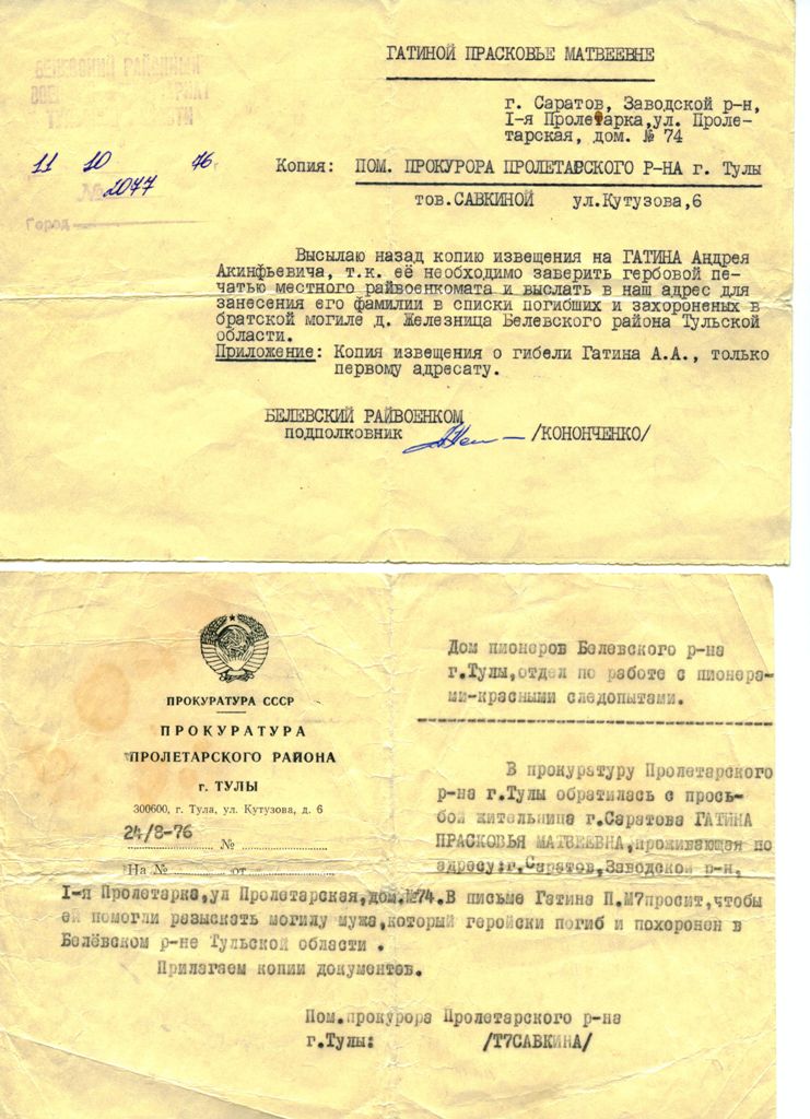 «Гатина Андрей Анкифьевича 1915г.р., звание рядовой, погибшего под д. Железницей Белевского р айона, Тульской обл. 15.02.1942г», а также про «У нас есть извещение о гибели командира части.(Народный Коммиссариат обороны СССР 1185-й Стрелковый полк от 28.08.1942 № 928.).»