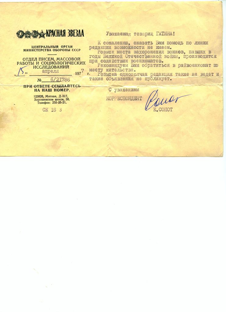 Вот еще документы. Бабушка даже писала в 1976 году в редакцию "Красная Звезда". Ей очень было обидно что у ее мужа нет могилы. Он был очень честным и смелым человеком. она даже искала его однополчан.Но к сожалению в то время не было Инета, телефонов и здоровья тоже убывало.Вот теперь наша очередь.