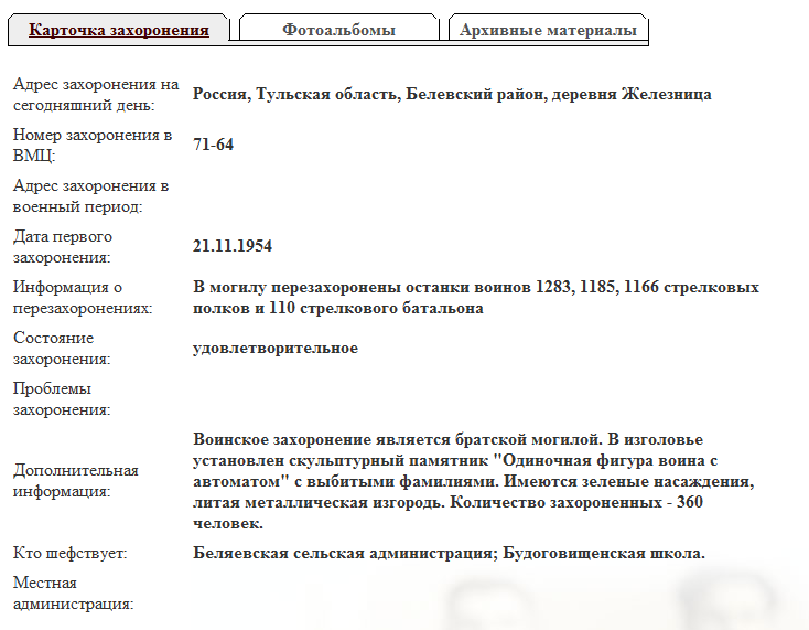Давно хотим найти братскую могилу нашего деда Гатина Андрей Анкифьевича 1915г.р., звание рядовой, погибшего под д. Железницей Белевского р айона, Тульской обл. 15.02.1942г. За поиском обращались в 1977 г. Ответ архива из Подольска - "Без вести пропавший"( архивная справка №9/473178 от 12.01.1977). У нас есть извещение о гибели командира части.(Народный Коммиссариат обороны СССР 1185-й Стрелковый полк от 28.08.1942 № 928.). Его дочь(моя мать) и внук (мой брат) приезжали найти могилу нашего родственника в 1977, в д.Железница, которая находилась на территории школы.Но в списке погибших на Братской могиле данной фамилии не значилось. Гладя на современное фото мемориала в д. Железница, памятник очень отличается от памятника тех лет, 1977г. если Сможите нам помочь с нашими поисками, будем очень признательны)))))И хотелось бы узнать была ли реорганизация данного мемореала в д. Железница.