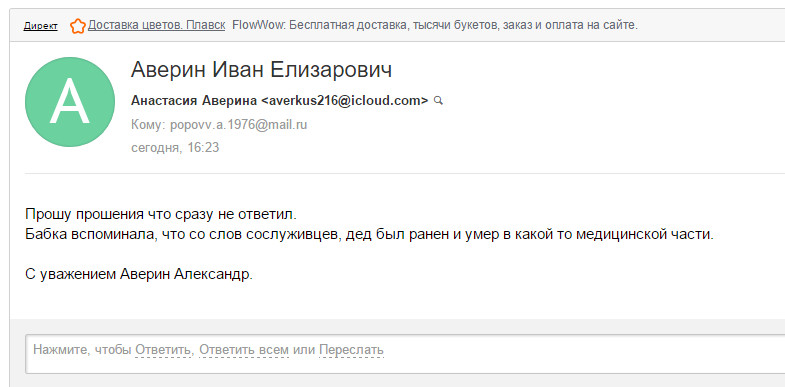 УВАЖАЕМЫЕ КОЛЛЕГИ. УЖ НЕ ЗНАЮ ТОЧНО, ЧЕМ ВСЕ ЭТО ЗАКОНЧИТСЯ, НО ВНУК АВЕРИНА МНЕ ОТВЕТИЛ. ЖЕНА АВЕРИНА ВСПОМИНАЛА, ЧТО ИВАН ЕЛИЗАРОВИЧ УМЕР В КАКОЙ ТО МЕДИЦИНСКОЙ ЧАСТИ. ПРИКРЕПЛЯЮ КАК РАЗ СКАН ЕГО СЛОВ С ПОЧТЫ. Прикрепленные файлы: