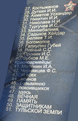 Потом останки всех захороненных там перенесли в Симоново. Из электронный Книги Памяти Тульской области: АВЕРИН Иван Елизарович, 30 СД, 20 ноябpя 1941 г. погиб и зах.: Тульская обл., Заокский р-н, д. Ненашево, перезах.: c. Cимоново, бр. мог. 4. | ||||
