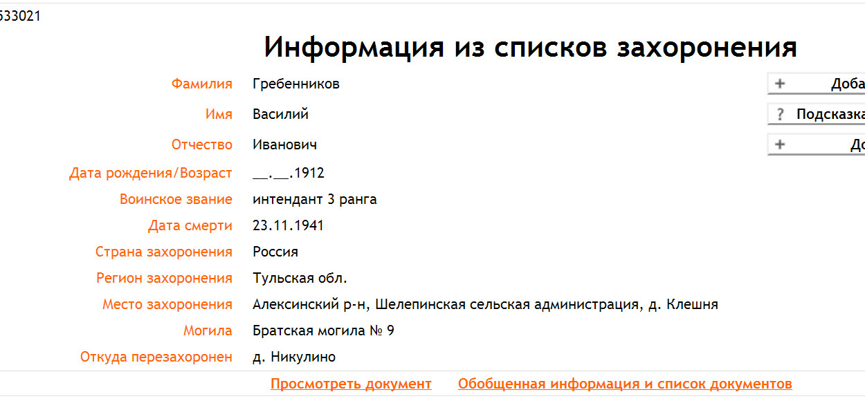 Валерий. Гребенников был в составе арт. полка 238 СД – военрач 3 ранга и захоронен в общей могиле ОКОЛО Никулино, там же были и другие из арт. полка. Еще была одна общая могила вне Никулино, там были похоронены воины из 288 СП 64 СД (или 7 Гв. СД), в том числе возможно и их командир батальона Березутский (предположительно по званию капитан). Эти могилы перенесли в Клешня. А копали в самой деревне Никулино!!! | ||||