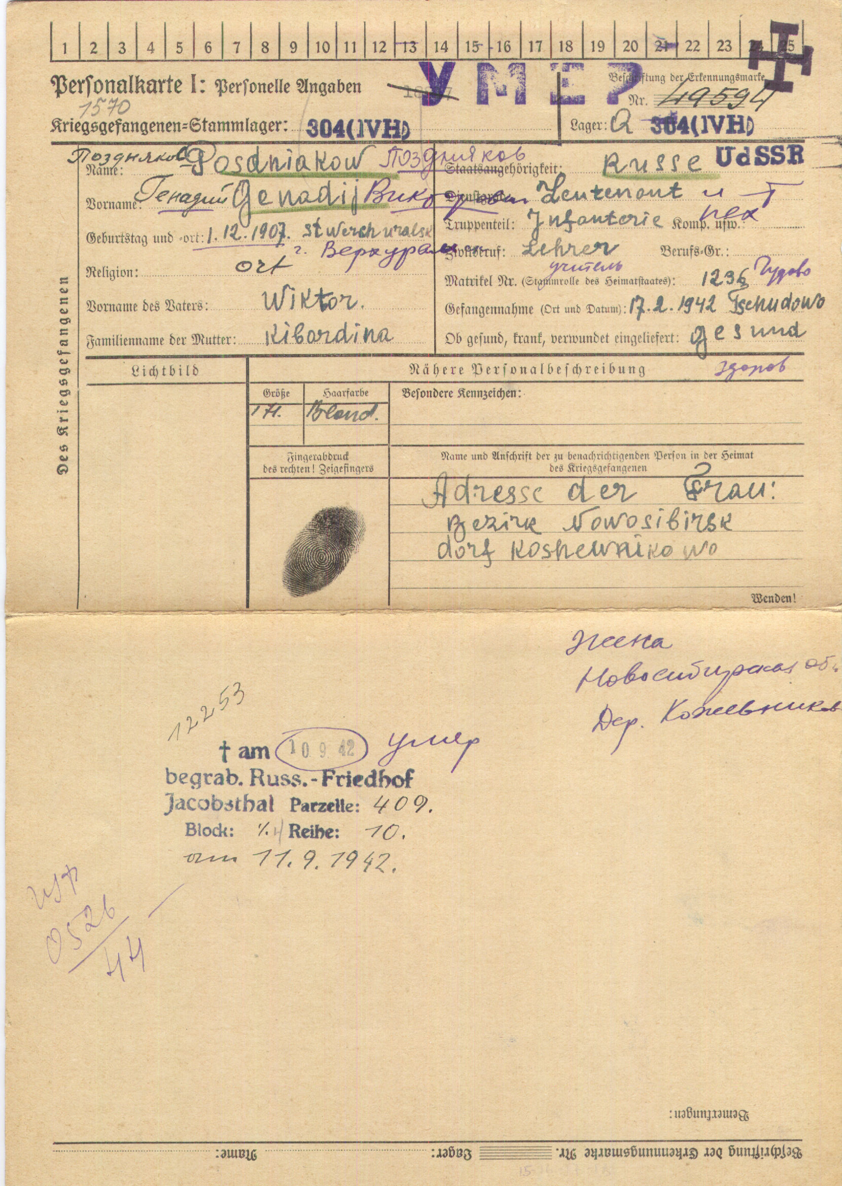 Никонов Сергей: Здрасвуйте, Сергей! Спасибо. Эта карточка у меня уже есть. Из неё мы многое взяли. Толко хочется ещё узнать, как он туда попал в шталаг 304 из 336 шталага Каунаса? | ||||