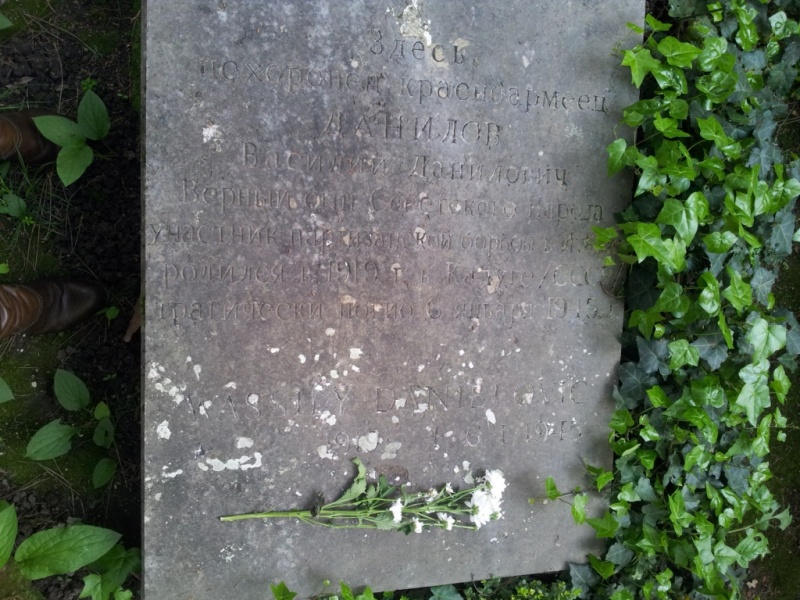 «Здесь (На Римском некатолическом кладбище, номер могилы 1110) похоронен красноармеец Данилов Василий Данилович. Верный сын Советского Народа, участник партизанской борьбы в Италии. Родился в 1919 г. в Калуге, трагически погиб 6 января 1945 г. VASSILY DANIЕLOVICH, 1919 + 6J1945»