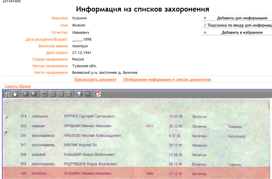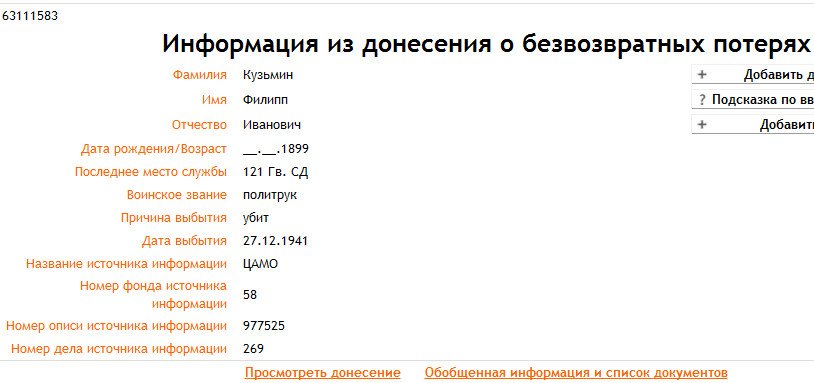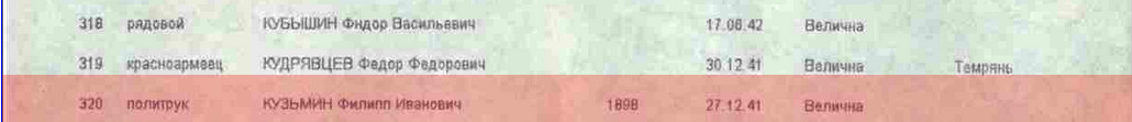 Валерий. 1.Понятно, что это один и тот же Кузьмин из Саратовской области. 2. Вы нашли донесение о безвозвратных потерях, в котором указано место захоронения Кузьмина Велична? 3. Первичный документ- донесение о безвозвратных потерях. Именные захоронения, книги памяти появились позже. Еще раз привожу первый документ с указанием места захоронения. В этом документе фамилия Кузьмин без мягкого знака: Информация из донесения о безвозвратных потерях Фамилия Кузмин Имя Филипп Отчество Иванович Дата рождения/Возраст __.__.1899 Место рождения Саратовская обл., Татищевский р-н, с. Слепцино Дата и место призыва Воскресенский РВК, Саратовская обл., Воскресенский р-н Последнее место службы 61 Арм. 342 СД 1150 СП Воинское звание политрук Место захоронения с. Фединское Причина выбытия убит Дата выбытия 28.12.1941 Название источника информации ЦАМО Номер фонда источника информации 58 Номер описи источника информации 818883 Номер дела источника информации 1078 В списке 13 человек командного состава 1150 СП Советую, пробейте каждого по ОБД Мемориал Донесения о безвозвратных потерях Номер донесения 4739 Тип донесения Донесения о безвозвратных потерях Дата донесения 09.04.1942 Название части ОК 61 Арм. 4. Объясните, на основании, какого документа якобы была похоронка, что Кузьмин убит и похоронен в д. Велична? 5. И с ваших слов - «А так это моя родная бабушка, которая его ждала до конца своей жизни». Почему она ждала, если по вашим словам якобы была похоронка с указанием места захоронения Велична. 6. Ваша информация о друге -«После войны в нашу семью пришло письмо его сослуживца. ОН рассказывал, что погиб и захоронен дед в Фединском» вполне возможно объясняет, почему сначала он был записан в именное захоронение Велична!!!! 7. По чьей просьбе был внесен Кузьмин в именные списки захоронения Велична в 1953 году? 8. Из электронной Книги Памяти Тульской области - КУЗЬМИН Филипп Иванович, pод.: 1918 г., политрук, 1150 СП 342 СД, 28 декабpя 1941 г. погиб и зах.: Тульская обл., Белевский р-н, д. Фединское. Но его нет в печатной книге (1918 г.р.). Почему??? 9. С какой целью записали Кузьмину в именном захоронении д. Фединское год рождения 1918? 10. - КУЗЬМИН Филипп Иванович, pод.: 1988 г., политрук, в списке именного захоронения д. Велична. Но его НЕТ в Книге Памяти Тульской области!!!!! Ни в печатной, ни в электронной. 11. История с Вашим дедом аналогична истории – Аверин Иван Елизарович. Поэтому я и просил Вас почитать расследование о нем. 12. Такие случаи не единичные. С уважением, ВИК | ||||||||||||