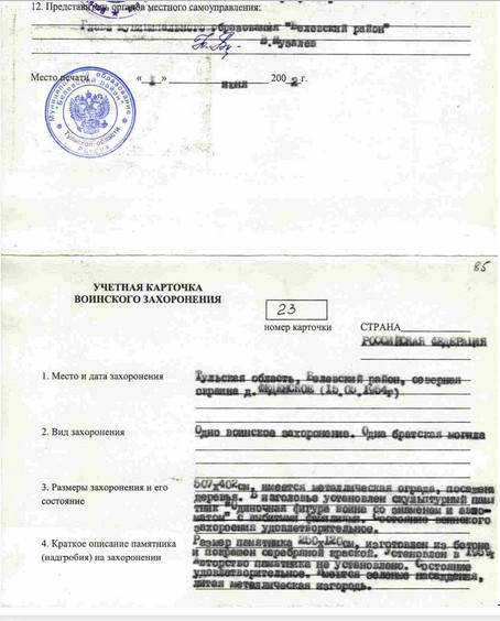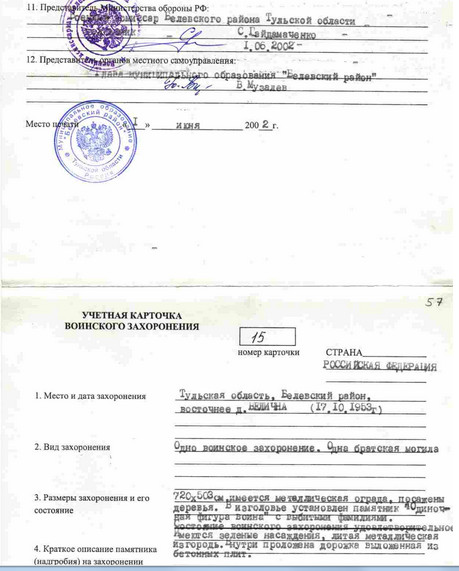 Вот документы о том, что военком Белевского района их подписал. И файлы про ситуацию по этим захоронениям я приложил. С уважением, Валерий Попов | ||||||||||||