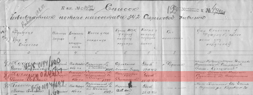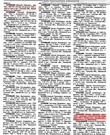 Отвечаю по пунктам. 2. Да. Я нашел Документ о безвозвратных потерях в котором местом захоронения указана Велична. Правда составлено оно позже. Тогда 342 - ю дивизию уже переименовали в 121 - ю гвардейскую. Смотрите первые три приложенных файла. 4. Про похоронку я знаю просто со слов матери. Документально ее нет. Тот экземпляр, что пришел в фронта утерян. 5. Бабушка ждала его просто так , не веря похоронке. 6. Будьте добры, объясните как мне трактовать Ваш ответ ( Ваша информация о друге -«После войны в нашу семью пришло письмо его сослуживца. ОН рассказывал, что погиб и захоронен дед в Фединском» вполне возможно объясняет, почему сначала он был записан в именное захоронение Велична!!!! ). Что это значит ( у вас восклицательный знак ). Его перезахоронили из Величны в Фединское??? 7. Никакой просьбы от родственников вносить деда в именные списки захоронения Велична не было. Туда его внесли по ошибке или не по ошибке тогдашние власти Тульской области. В результате внук сейчас разгребает эти завалы. 8. Лист из Книги памяти Белевского района Тульской области где там указан полиитрук Кузьмин Филипп Иванович 1918 года рождения у меня есть. Скриншот прилагаю. Там он в третьем столбике третий снизу. Прада в областной Тульской Книге памяти он в Фединском. Повторюсь. Слова моих родственников отражены только в Книгах памяти Саратовской области. 9. Никакой цели записывать деда в именное захоронении д. Фединское год рождения 1918 не было. Так его записали власти Тульской области. Это просто ошибка. 10. Согласен, что в книге памяти Тульской обасти нет такой записи. КУЗЬМИН Филипп Иванович, pод.: 1988 г., политрук, в списке именного захоронения д. Велична. Но его НЕТ в Книге Памяти Тульской области!!!!! Ни в печатной, ни в электронной. Почему, я не знаю. По словам родственников составлялись только Книги памяти в Саратовской области. 11. Я хорошо понимаю , что моя история аналогична истории – Аверин Иван Елизарович. Ну...в этом смысле вроде нас больше устраивает , что дед похоронен в Фединском ( по этому селу и доказательств больше и письмо друга было ). Но опять не состыковка есть. Дед погиб в начале этих боев. То есть. Я читал, что вроде бы сначала брали Величну, а не Фединское. 12. Хочу знать Ваше личное мнение. Сейчас я переправил вам видимо уже все документы. Видите, я даже документ о безвозвратных потерях по Величне нашел. Хотелось бы еще получить фото с плит этих захоронений. Вообще мечтаю о том, чтобы могила была одна. Но стоит ли что-то менять? Могу ли я что то доказать? Если доказывать, то надо "напирать" на версию Фединского или Величны. Вот после последних изменений... (так как я нашел Документ о безвозвратных потерях в котором местом захоронения указана Велична), где же он в итоге то похоронен , Как вы думаете??? Большое Вам спасибо. С уважением Валерий. Прикрепленные файлы: