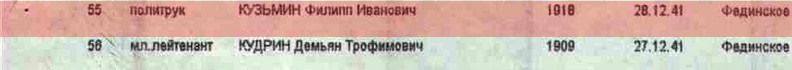 Сначала по п. 2. Документ о безвозвратных потерях, в котором местом захоронения указана Велична. Почему те, кто погиб и захоронен в Величне, не указаны в именном захоронении Велична, как ваш дед? Кудрин Демьян Трофимович, 1909 г. рождения, мл лейтенант оказался, как и Кузьмин в именных списках захоронения Феденское, но его тоже, как и других, нет в Величне. | ||||||||||||