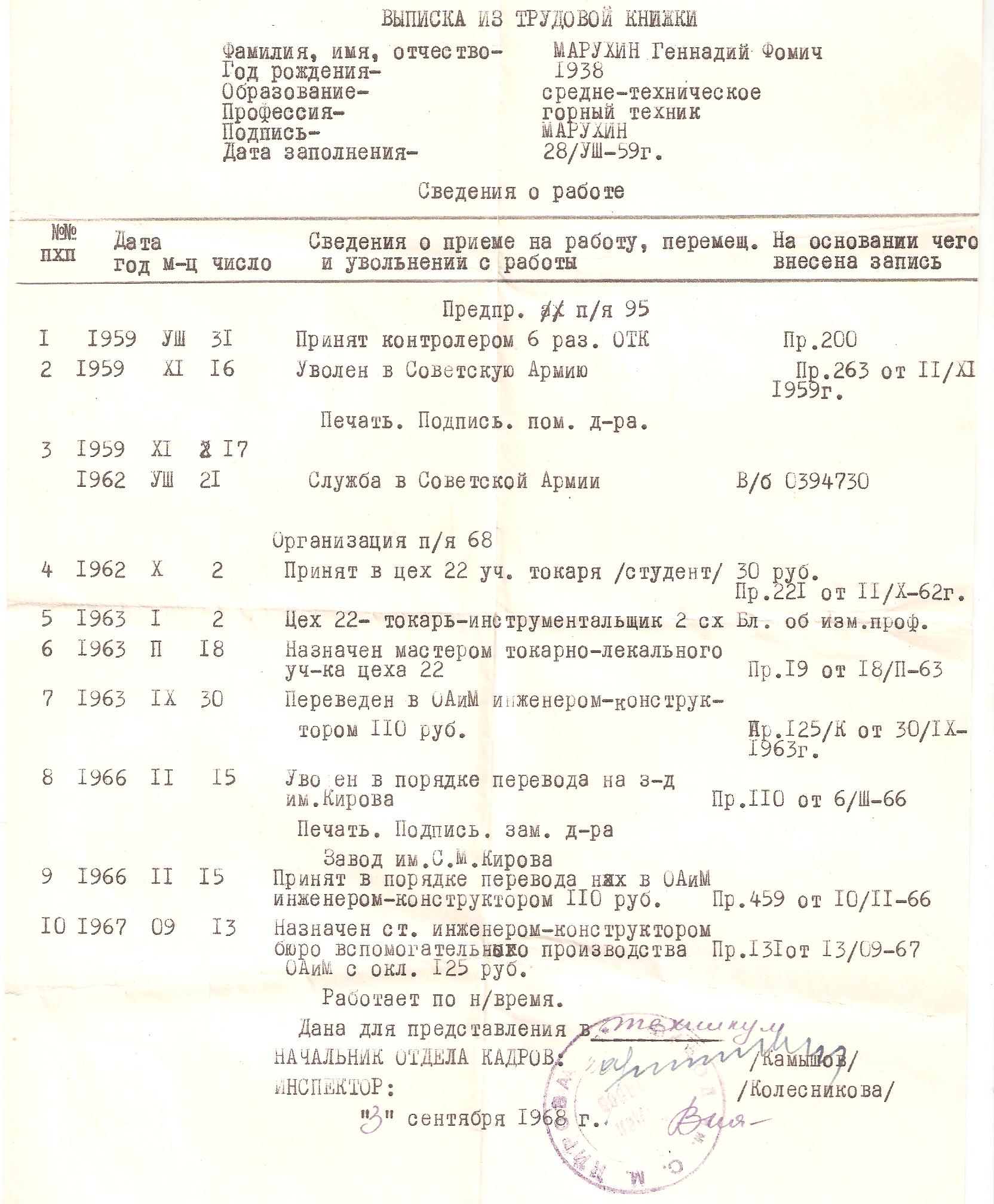 В ОБД Мемориал - Марухин Фома Сергеевич – только один документ: Информация из донесения о безвозвратных потерях Фамилия Марухин Имя Фома Отчество Сергеевич Дата рождения/Возраст __.__.1902 Дата и место призыва доброволец Последнее место службы 217 сд Воинское звание красноармеец Причина выбытия убит Дата выбытия 15.01.1942 Название источника информации ЦАМО Номер фонда источника информации 58 Номер описи источника информации 818883 Номер дела источника информации 435 Данное донесение было составлено только в августе 1942 года, когда Тульский рабочий полк вошел в состав 217 СД: Донесения о безвозвратных потерях Номер донесения 18211 Тип донесения Донесения о безвозвратных потерях Дата донесения 03.08.1942 Название части 217 сд Марухин Фома Сергеевич не включен в Книгу памяти Тульской области, как и ряд других бойцов Тульского рабочего полка из списка этого донесения. Встает вопрос, а было ли извещение о его гибели по адресу г. Тула, ул. С. Перовской, д.5.? Видимо, нет. Сейчас выяснилось, что, Марухин Фома Сергеевич, убитый в Калужской области, был похоронен в Туле. Нашлась его внучка Авдеева Ирина Геннадьевна, которая несколько лет ищет могилу деда. Предварительно установили, что траурный митинг - Марухин Фома Сергеевич – был 21 января 1941 г. в кинотеатре им. Степанова Пролетарского района г. Тулы. Авдеева Ирина Геннадьевна сообщает, что ее отец Марухин Геннадий Сергеевич – сын Марухина Фомы Сергеевича работал на Кировском заводе Пролетарского района г. Тулы. Пока мы не знаем, кем, в каком цехе и когда работал на этом заводе Марухин Геннадий Сергеевич (1935 г.р.). Просьба к Сергею Никонову приять участие в поиске. Ведь вы и ваш отец работали на Кировском заводе. | ||||||||||||||||