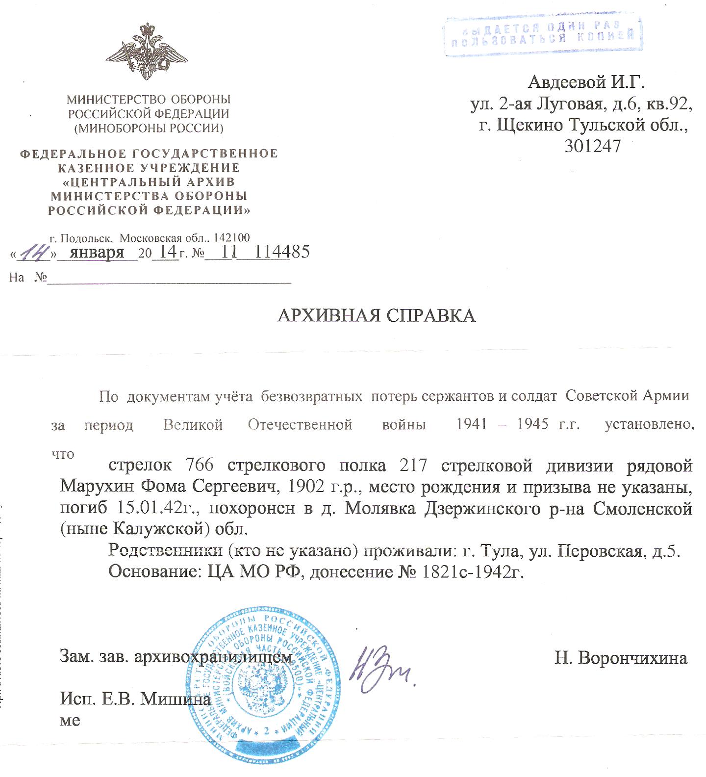 ирина авдеева: Михаил! Мне надо написать запрос в Пролетарский военкомат по поводу анкеты на отца? Как правильно и локонично сформулировать вопрос? Ирина Геннадиевна, запрос на установление места захоронения родственника МАРУХИНА Ф.С., добровольца Тульского Рабочего полка, по документам Вашего архива. 1. Проверить списки по ТРП 2. Проверить личное дело МАРУХИНА ГЕННАДИЯ ФОМИЧА, 1937 г.р., призванный Вашим военкоматом и проходившим срочную службу в в/ч 0394730 с 17.10.1959 по 21.08.1962 Редактировалось: 4 раз (Последний: 17 ноября 2013 в 13:17) | ||||