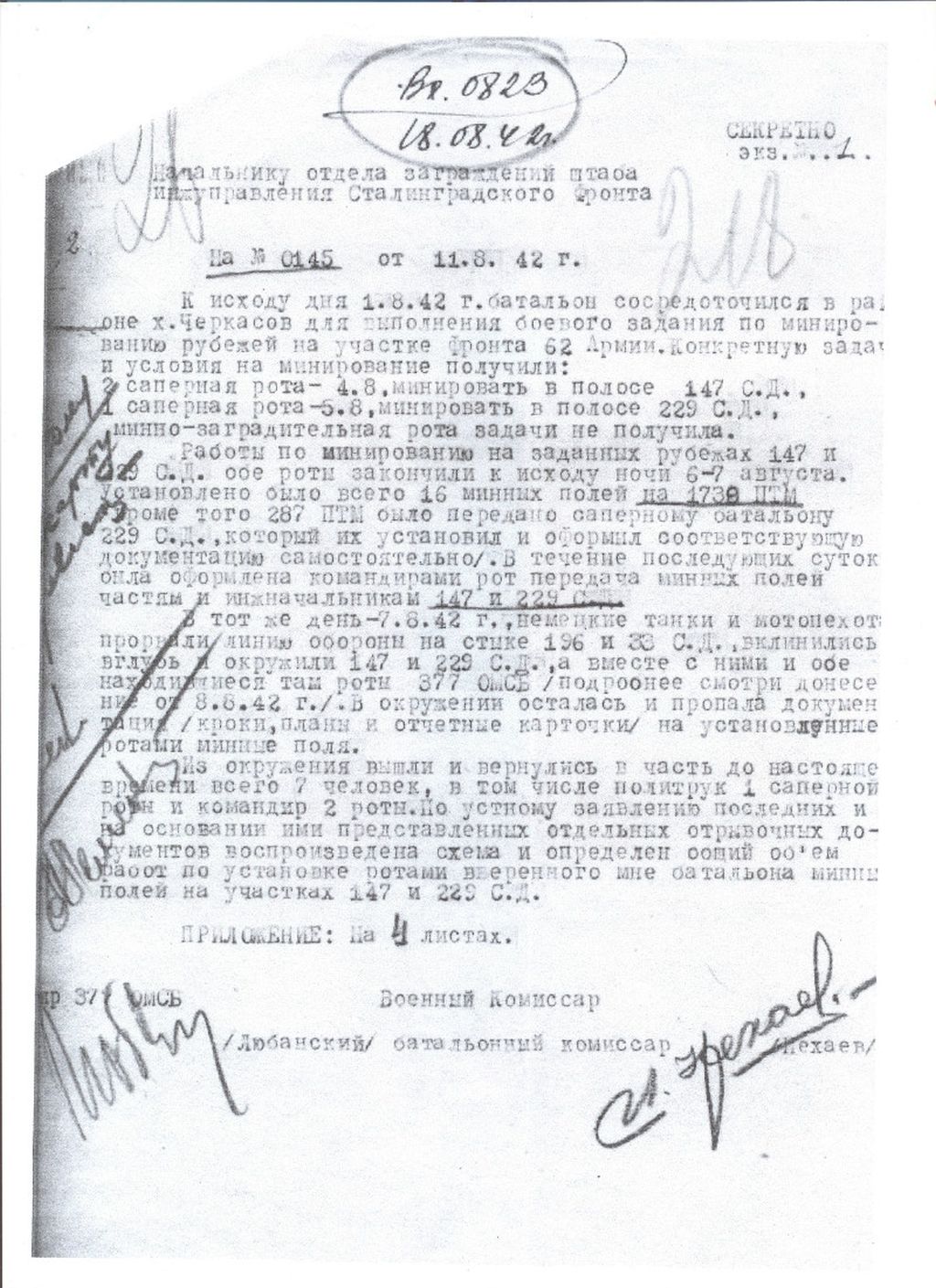 Данные которые получилось найти: Последнее боевое задание 377 отдельного минносаперного батальона - Сталинградский фронт. Место дислокации х.Черкасов. Не вернулись с задания с правого берега Дона.