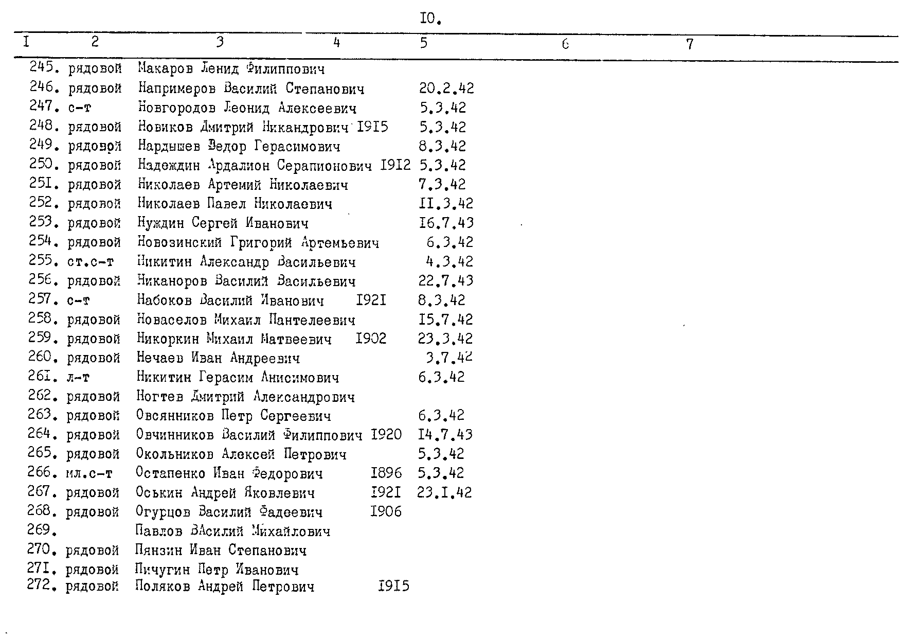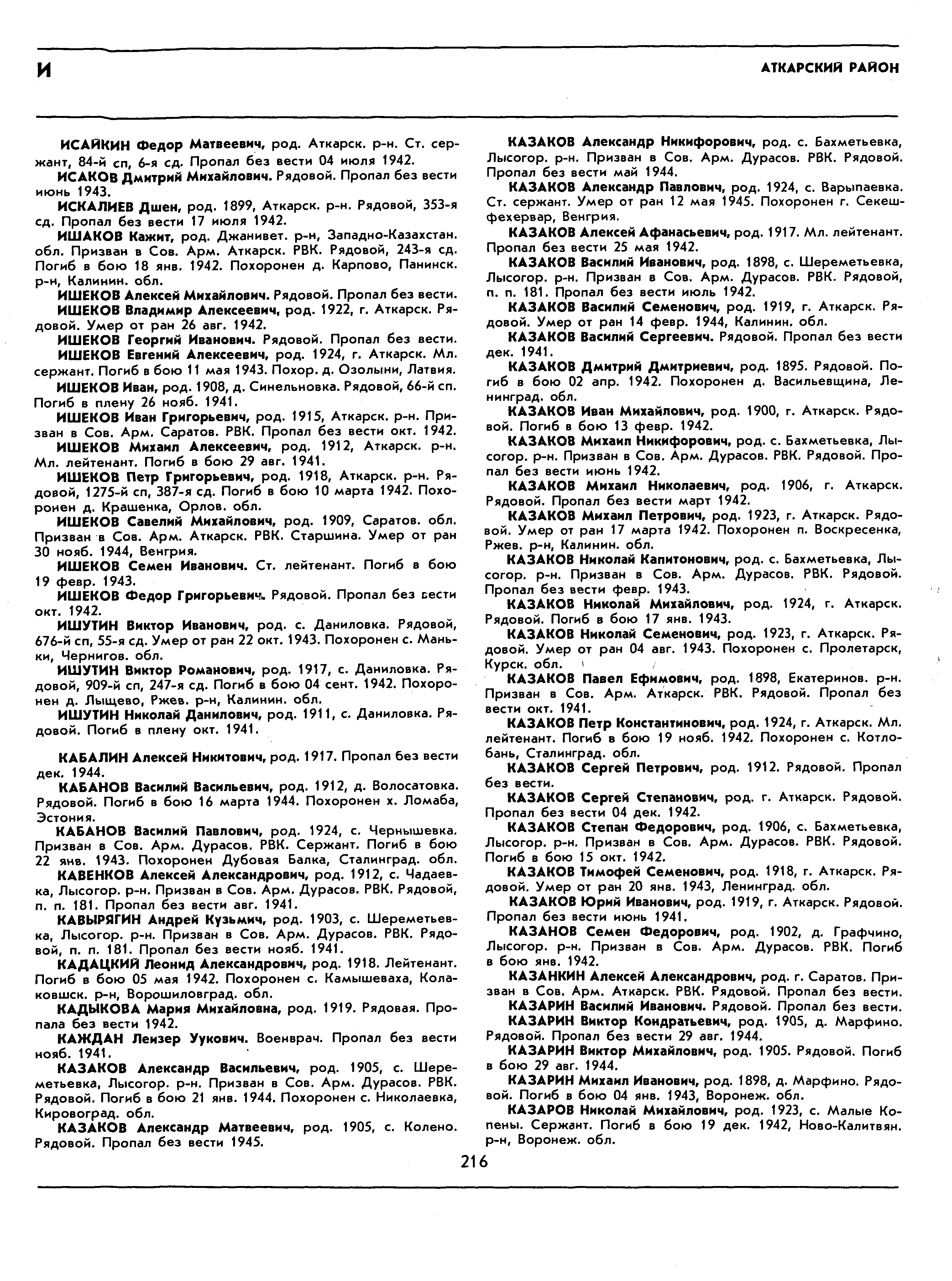 Вотинцева Татьяна: Коллеги, вот ещё один пример: Фамилия Буханов Имя Марк Отчество Васильевич Дата рождения/Возраст __.__.1903 Место рождения Воронежская обл., Райзовский р-н, с. Н.-Солдатское Дата и место призыва Репьевский РВК, Воронежская обл., Репьевский р-н Последнее место службы 387 сд Воинское звание красноармеец Причина выбытия убит Дата выбытия 07.03.1942 Название источника информации ЦАМО Номер фонда источника информации 58 Номер описи источника информации 818883 Номер дела источника информации 1182 Прикрепленные файлы: