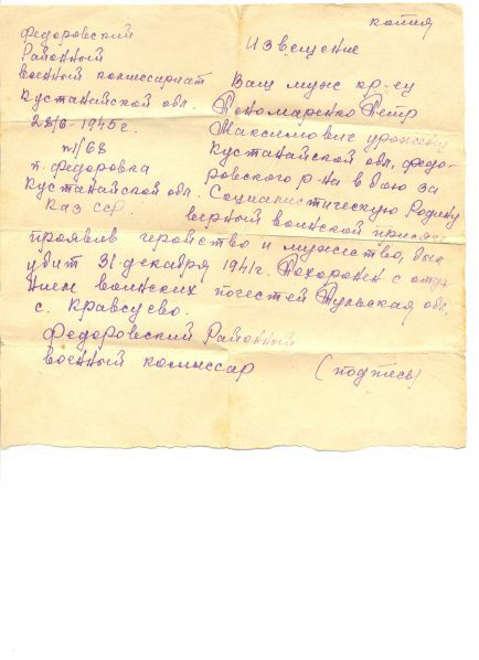 Куренков Виктор Иванович: Извещение из воекомата отправлено 28 июня 1945 г. Странно. Тогда вопрос, на основании какого документа вонкомат отправил извещение родным? Кстати, вверху написано "КОПИЯ". А это что может значить? | ||
