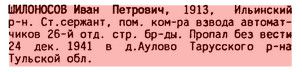 Ничего особо нового по ШиЛоносову нет, кроме того, что он пропал без вести. Вот есть донесение. Ну и есть записи в Книге памяти. Там есть и Поляков и Митрофанов. Редактировалось: 1 раз (Последний: 11 февраля 2014 в 12:05) С уважением, Валерий Попов |