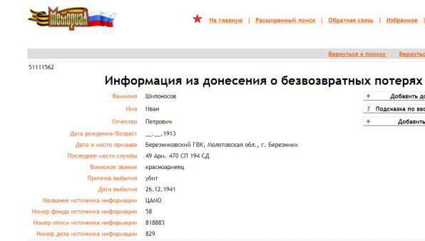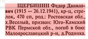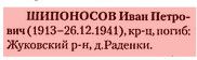 Шипоносов вот по Книге Памяти как раз погиб в Московской области. У него в донесинии есть сосед Щербинин Федор Данилович. Так вот. Следы их гибели...Там схожее название деревни, но при этом разные районы (это по книге памяти), а по донесению деревня одна. С уважением, Валерий Попов |