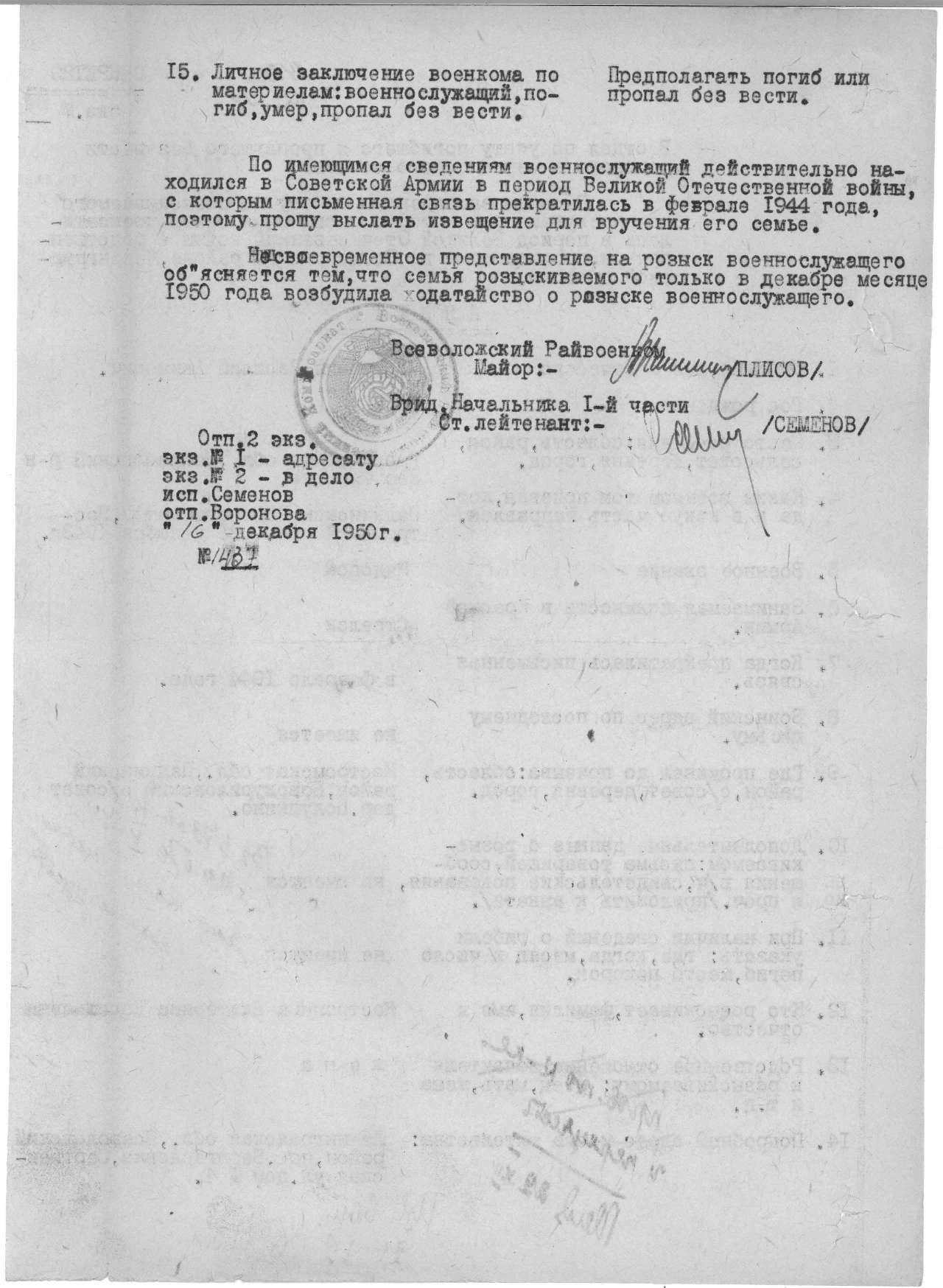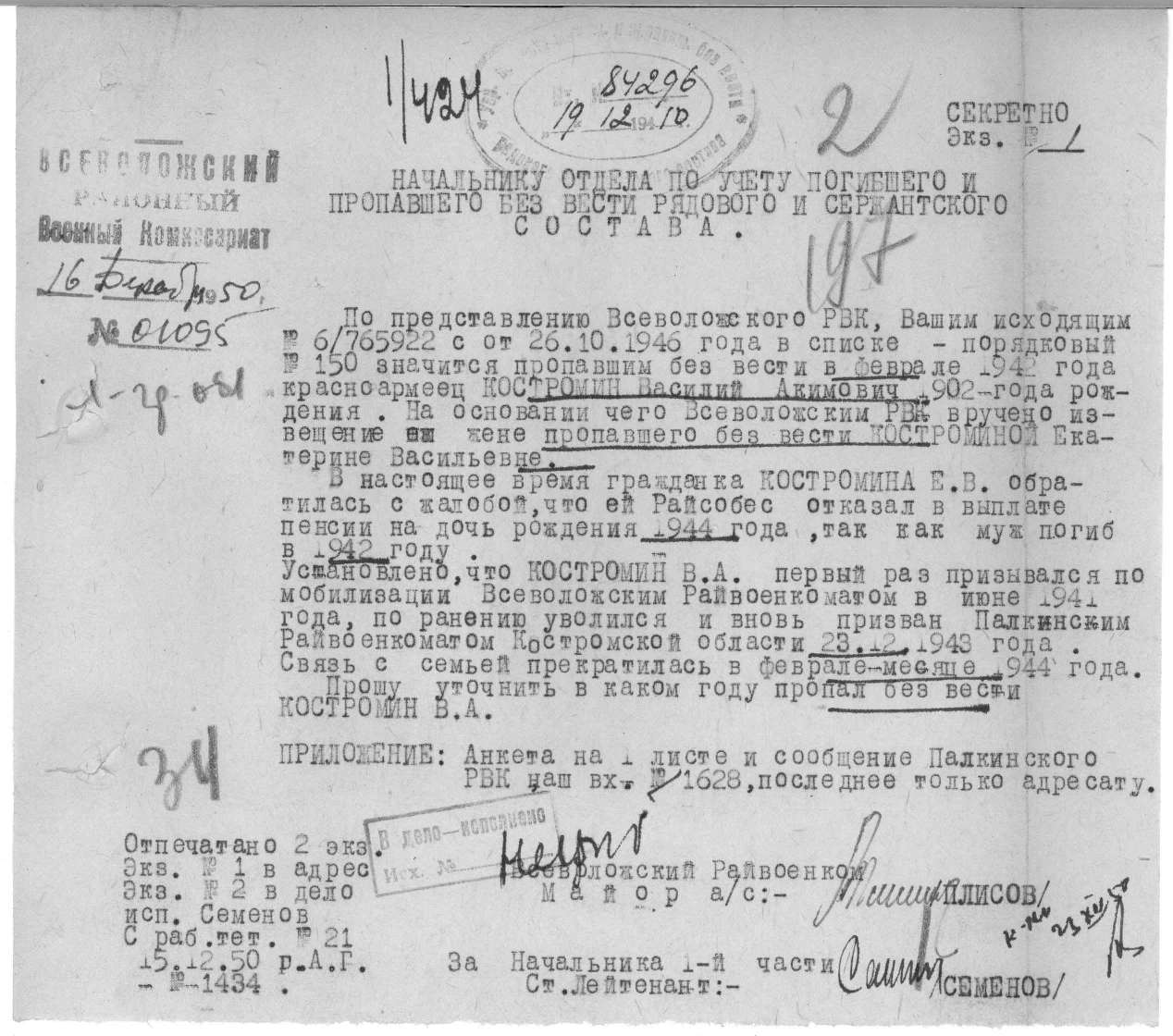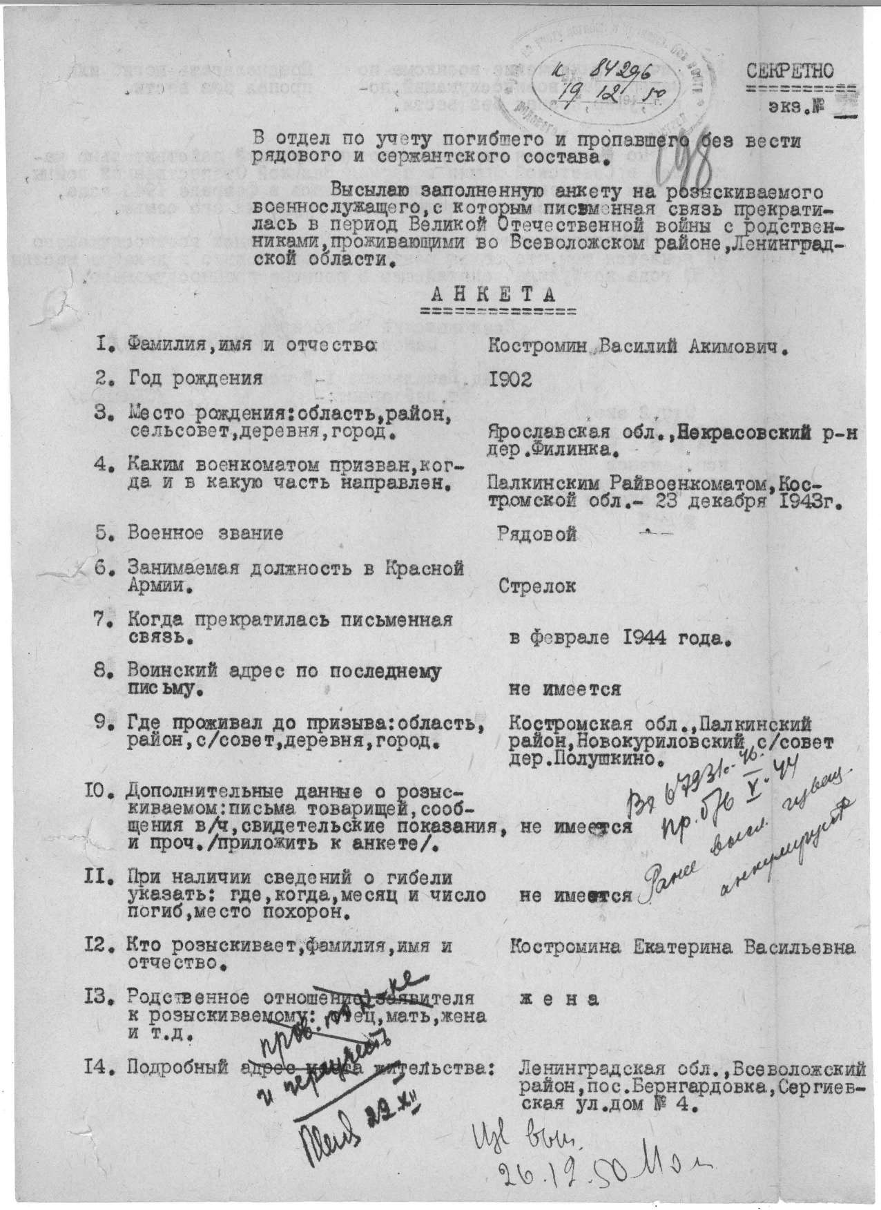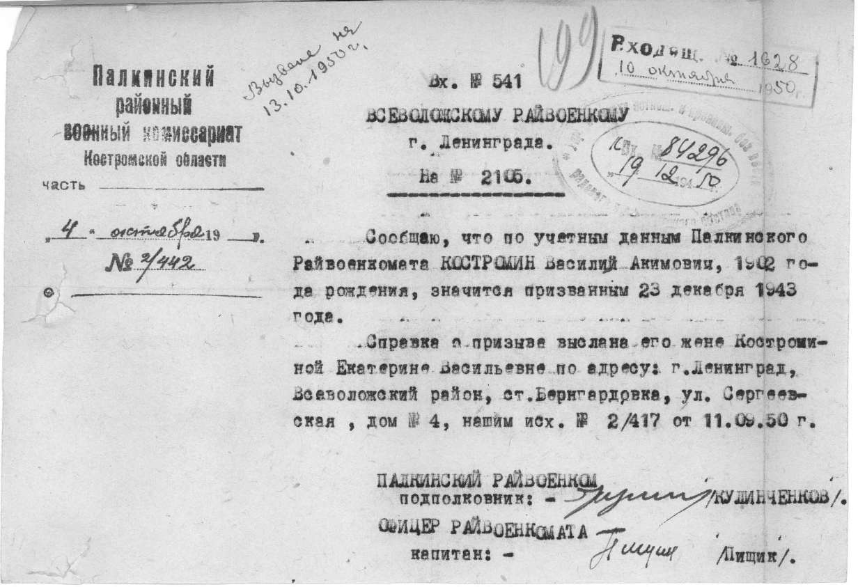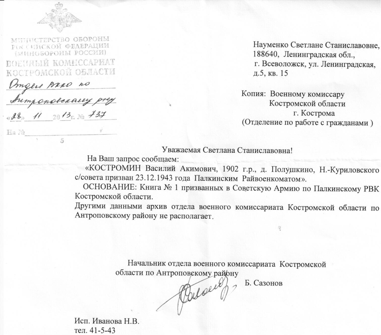 Запрос в военкомат Костромской области тоже не дал никаких дополнительных сведений (ответ из военкомата ниже).