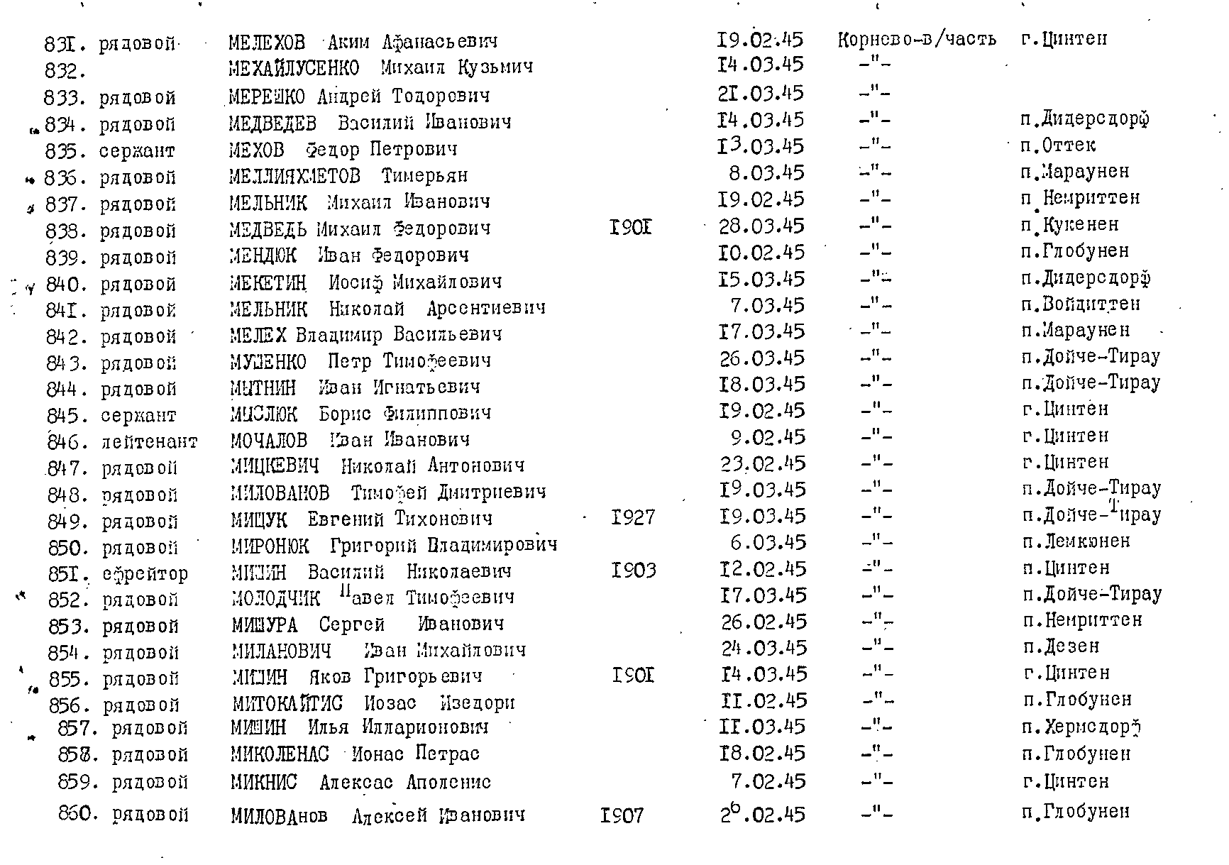 Уважаемый заявитель! Сведения по вашему прадеду, в том числе, по месту захоронения, найдены. В документах была допущена ошибка в отчестве и частично в месте рождения. Наши предположения по поводу Цинтена подтвердились. Судьбу вашего прадеда установил Виктор Иванович Куренков.