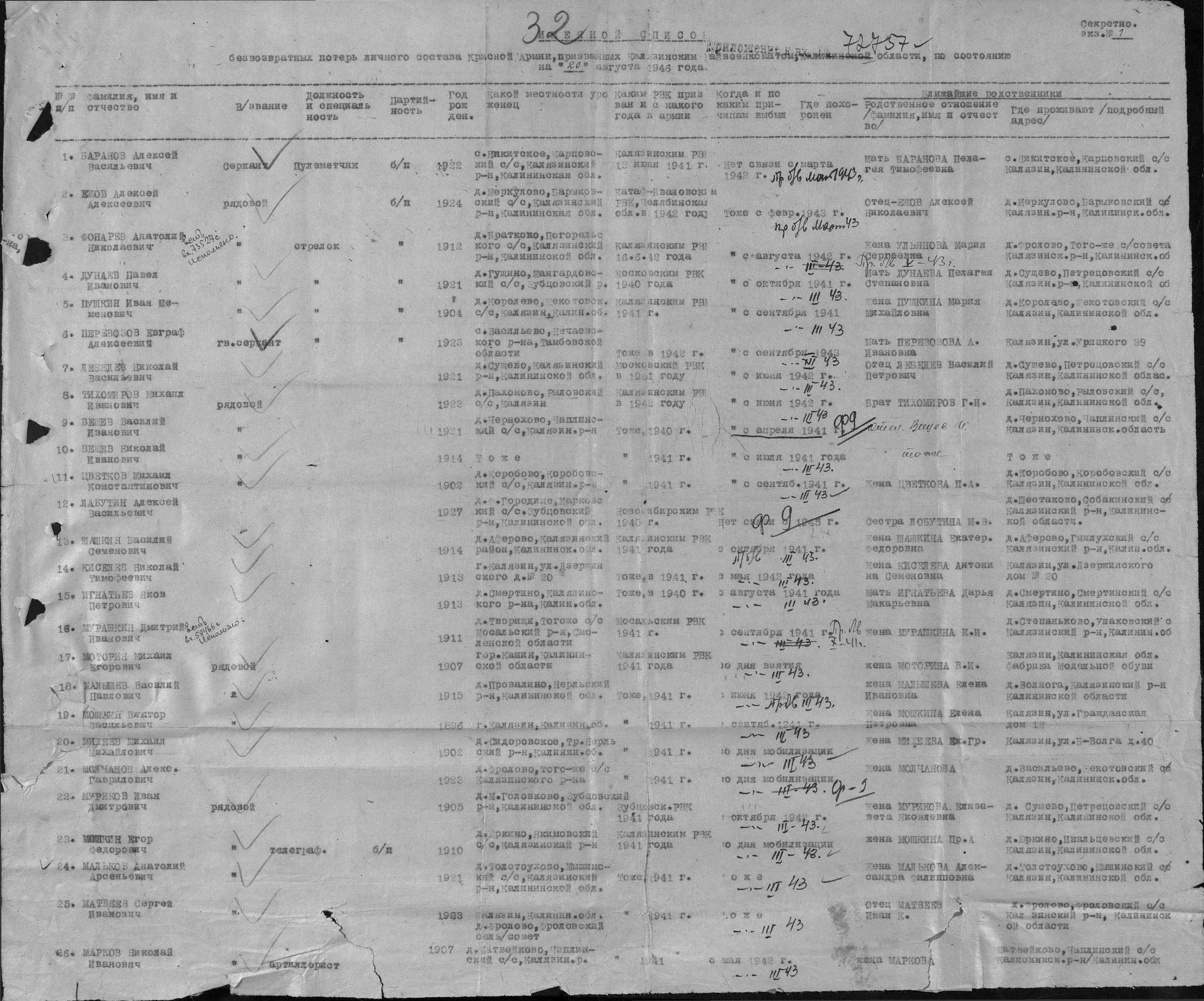 Внимательно прочитайте документ, уточняющий потери.Там у многих дата сентябрь. Из Калязинского РВК они ушли на фронт одной командой и видимо в одной дивизии воевали. Коробково было под немцем? | ||||