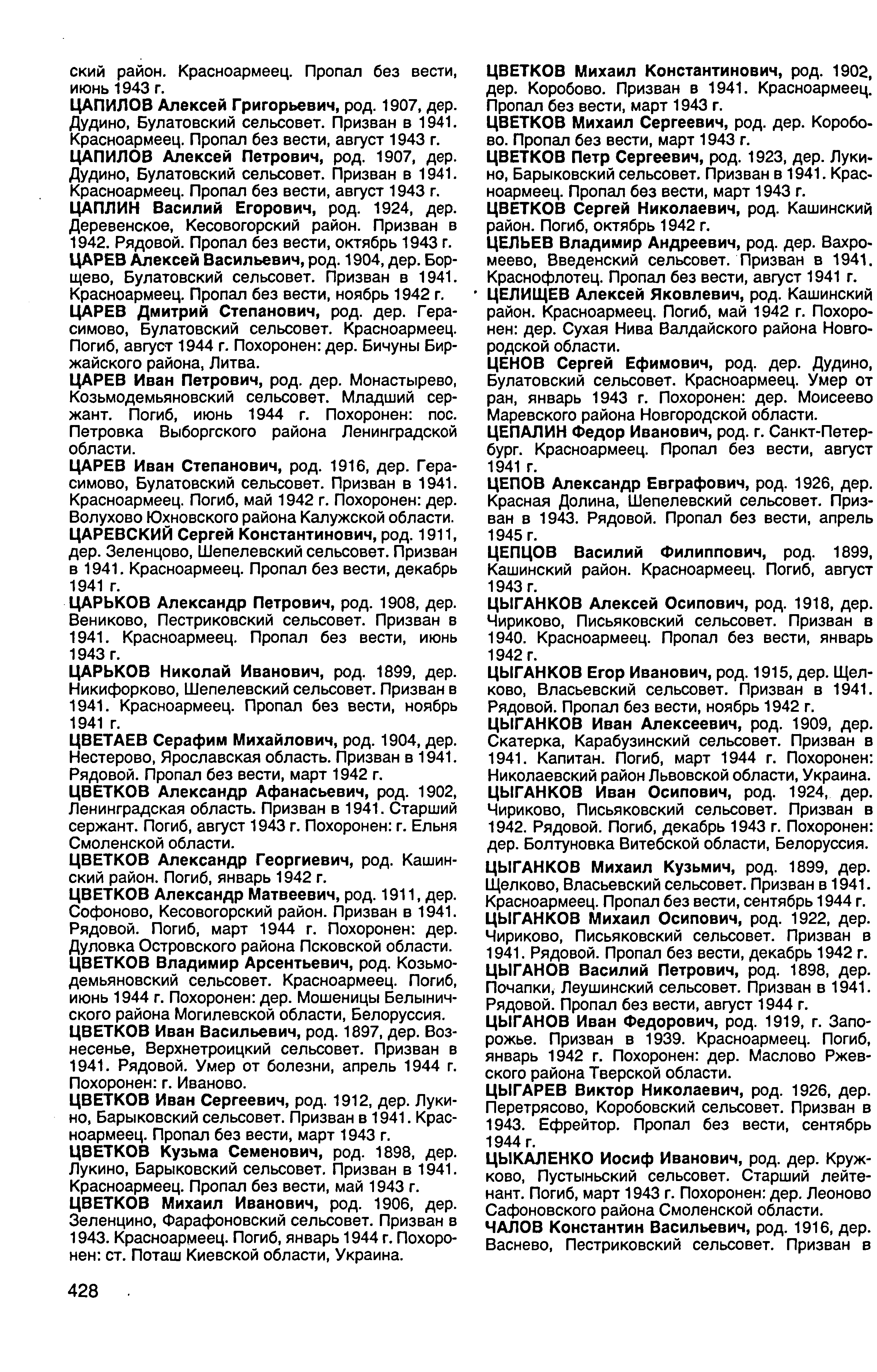 Информация из Книги Памяти Фамилия ЦВЕТКОВ Имя Михаил Отчество Константинович Дата рождения/Возраст __.__.1902 Дата выбытия __.__.1943 Название источника информации Книга памяти. Тверская область. Том 6 Март 1943 г. Информация из документов, уточняющих потери Фамилия Цветков Имя Михаил Отчество Константинович Дата рождения/Возраст __.__.1902 Место рождения Калининская обл., Калязинский р-н, Коробовский с/с, д. Коробово Дата и место призыва __.__.1941 Калязинский РВК, Калининская обл., Калязинский р-н Воинское звание рядовой Причина выбытия пропал без вести Дата выбытия __.03.1943 Название источника информации ЦАМО Номер фонда источника информации 58 Номер описи источника информации 18004 Номер дела источника информации 469 | ||||