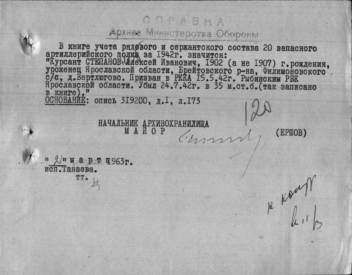 Справка архива министерства обороны выдана на основании Книги учёта рядового и сержантского состава 20 запасного артиллерийского полка за 1942 год. Значит эта книга есть, и заявитель может сделать запрос в ЦАМО по Петру Аникеевичу. В справке указана часть, в которую выбыл курсант Степанов Алексеевич 1902 года рождения. Прикрепленные файлы: