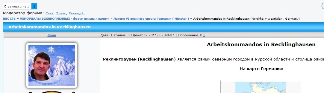 [quote=Садовников Денис - руководитель поискового центра "Искатель"] Коллеги, мне кажется, что расхождения между документами нет. Во всех случаях речь идет об одном и том же лагере - шталаг 3А. Место захоронения также указано четко. [/quote] Спасибо за ответ! Я сомневаюсь в том, что на странице сайта указан лагерь VI военного округа Германии: ВВС СГВ » МЕМОРИАЛЫ ВОЕННОПЛЕННЫХ - форум поиска и памяти » Лагеря VI военного округа Германии ( Münster ) » Arbeitskomandos in Hochlarmark (Nordrhein-Westfalen, Germany) и в карточке военнопленного: 27.07.42 - Stalag III A 30.09. 1943 Stalag VI A | ||||