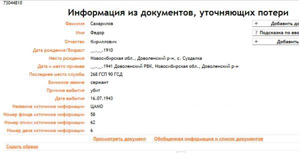 В последней клетке указано место гибели Сахарилова, но не разборчиво. Записи "Человек-Захоронение на него нет. С уважением, Валерий Попов |