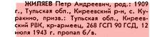 Информация из Книги Памяти Фамилия ЖИЛЯЕВ Имя Петр Отчество Андреевич Дата рождения/Возраст __.__.1909 Дата выбытия 12.07.1943 Название источника информации Книга памяти. Тульская область. Том 7 |