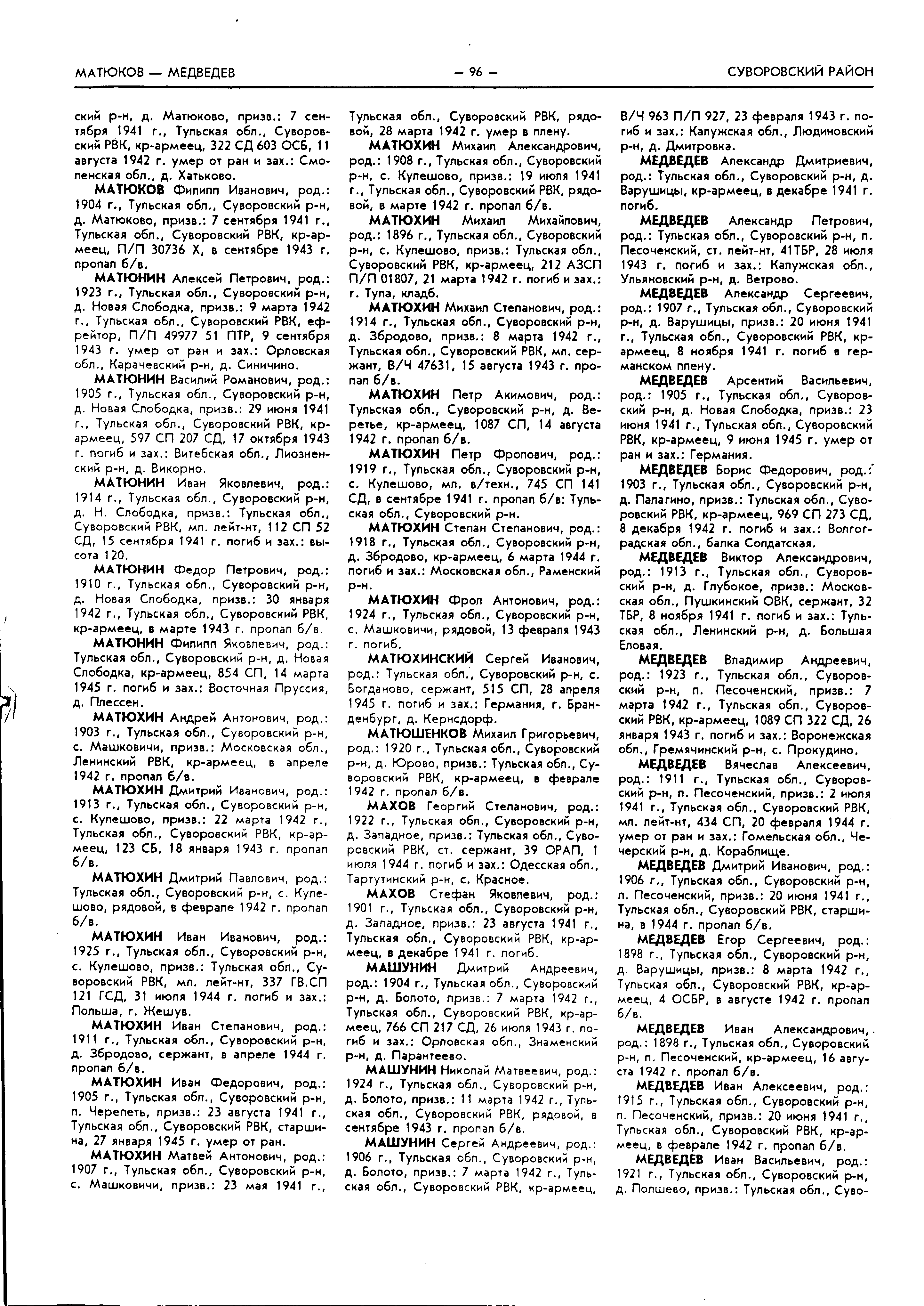 Итак. Мы имеем. 1. Дома оставалась жена: Медведева Пелагея Павловна. 2. Пропал без вести он в 1943 году. Военные действия на территории Ленинского района Тульской области в то время уже не велись. С уважением, Валерий Попов | ||||