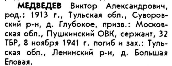 А вот и подтверждение из Книги памяти: Информация из Книги Памяти Фамилия МЕДВЕДЕВ Имя Виктор Отчество Александрович Дата рождения/Возраст __.__.1913 Дата выбытия 08.11.1941 Название источника информации Книга памяти. Тульская область. Том 9 Здесь он правда сержант. Погиб и захоронен: Ленинский район, Б. Еловая. Прикрепленные файлы:
