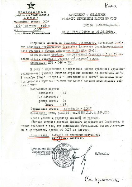 В ЦАМО нет данных (фамилий) курсантов Тульского оружейно-технического училища, которые участвовали в боях в октябре 1941 г. |