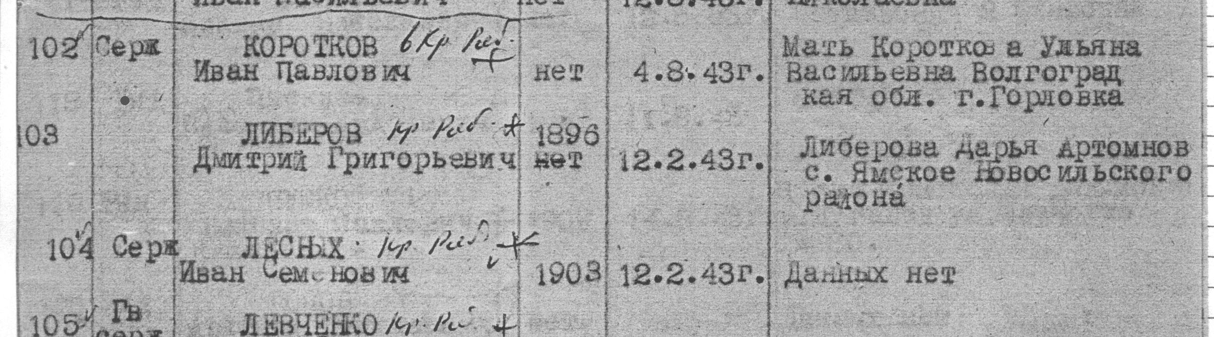 Виктор Иванович. 3 бойца из фрагмента реестра захоронения в с.Никольском, что прислали из школы, Левченко, Либеров, и Лисных - это одни из тех 13 бойцов странным образом перезахороненных из Пролетарского в Никольское. По карточке воинского захоронения № 30, 31, 32 соответственно. По реестру №105, 104, 103 соответственно. По Донесению 12Гвсд №104, 101, 108 соответственно. | ||||
