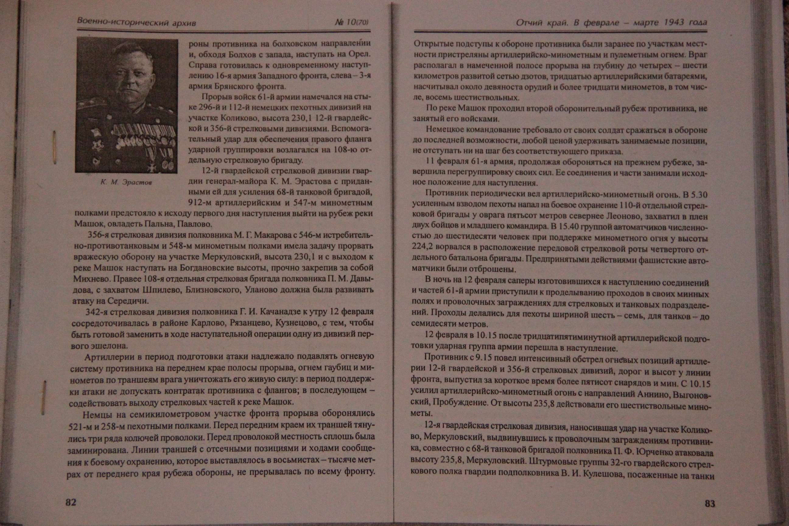 Садовников Денис - руководитель поискового центра "Искатель" Наступательная операция была завершена 12 июля 1942 г. Ценой больших потерь советским дивизиям удалось продвинуться вперед на 1 – 5 км, но затем, предприняв ряд контратак, противник восстановил положение. Только в ночь с 11 на 12 июля 1943 года войска 11 гвардейской армии прорвали оборону противника на всю тактическую глубину на фронте в 23 км и продвинулись на юг на 12-15 км, охватывая Болховскую группировку противника с запада и северо-запада Здравствуйте Денис. Спасибо большое за участие и ссылку на материалы по дивизии. Применительно к данному случаю в первую очередь интересует период февраль 1943г. А точнее 12 февраля 1943г. К сожалению, в материалах по ссылкам этот временной промежуток пуст и ограничивается летом 1942г. с одной стороны и общей информацией за 12 февр.1943г. "Наступательная операция была завершена 12 июля 1942 г. Ценой больших потерь советским дивизиям удалось продвинуться вперед на 1 – 5 км, но затем, предприняв ряд контратак, противник восстановил положение. Только в ночь с 11 на 12 июля 1943 года войска 11 гвардейской армии прорвали оборону противника на всю тактическую глубину на фронте в 23 км и продвинулись на юг на 12-15 км, охватывая Болховскую группировку противника с запада и северо-запада" Попробовать найти сведения о боевых действиях дивизии за интересующий период (февраль 1943г.) - это одна из целей которую я преследовал, когда обратился за помощью на форум. Данные о том, где была дивизия в этот момент времени помогли бы определиться с сутью вопроса (поиск самого Пролетарского, который я долго найти вообще не мог). Собственно теперь на этот вопрос ответ есть. Вот этот информационный пробел в истории 12Гвсд в данный промежуток времени на фоне остальных нестыковок и породил такое количество "вопросов". Редактировалось: 3 раз (Последний: 28 марта 2014 в 22:58) | ||||