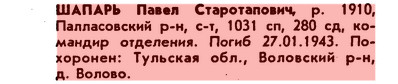 Валерий Попов: Тульскую версию подтверждает плита из Волово. Там Шапарь предпоследний. Видимо, банальное совпадение названий. Хотя, можно проверить по боевому пути 280 сд. | ||||