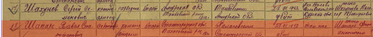 Думаю, Шапарь должен быть увековечен вот здесь: Информация о захоронении Страна захоронения Россия Регион захоронения Липецкая обл. Номер захоронения в ВМЦ 48-5 Место захоронения Воловский р-н, с. Волово Вид захоронения братская могила Количество могил 1 Захоронено всего 168 Захоронено известных 168 Захоронено неизвестных 0 Кто шефствует над захоронением Воловская средняя школа Воловского р-на Липецкой обл. Собственно, он там и увековечен, но отчество исказили:должен быть Старотапович, а записали Стритонович Редактировалось: 1 раз (Последний: 20 марта 2014 в 17:45) | ||||
