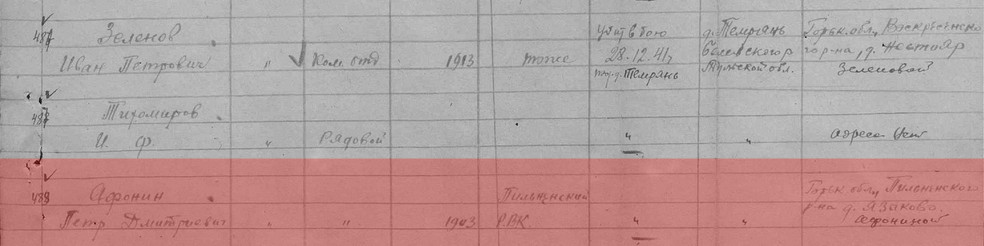 А вот три записи из электронной Книги памяти Тульской области: АФОНИН Петр Дмитриевич, pод.: 1906 г., кр-армеец, 1089 СП 322 СД, 27 декабpя 1941 г. погиб и зах.: Тульская обл., Белевский р-н, c. Темрянь, перезах.: д. Велична. АФОНИН Петр Дмитриевич, род.: 1903 г., Горьковская обл., Пильнинский р-н, Языковский с/с, с. Языково, рядовой, погиб в 1943 г., останки найдены в октябре 2001 г. у д. Кализна Белевского р-на Тульской обл., 6 мая 2002 г. и зах.: Тульская обл., Белевский р-н, Курган Бессмертия, мог. 44. АФОНИН Петр Дмитриевич, род.: 1903 г., Калининская обл., Пильненский р-н, в 1942 г. погиб и зах.: Тульская обл., Белевский р-н, Курган Бессмертия, м-44. | ||||