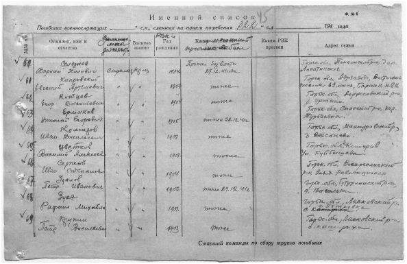 Коллеги. Калаганов и Афонин (останки по медальонам) найдены еще в те годы. Почти 12 и более лет. 1. Афанов есть в донесениях 322 СД. Кстати, Татьяна Николаевна, а сколько воинов погибли вместе с ним 28 декабря? 2. На Курган привезли 90 останков. Откуда они? 3. Надо пробивать еще 2-х, что на плите!! 4. Денис не сможет прояснить ситуацию, т.к. ранее не было строгой отчетности. Смотреть пост Аверин, как еще было в 2012 году!!! 5. Надо уточнять у Инициативной Группы, т.к. теперь там командиры «Надежда» и «Искатель». Командиры должны членораздельно ответить: а) где и когда были найдены останки с медальонами – 4 -х воинов. Были эти останки в одиночных воинских захоронениях? Или в братских воинских захоронениях? Откуда 90 неизвестных воинов? | ||||