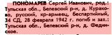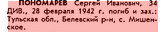 ПОНОМАРЕВ Сергей Иванович, pод.: Тульская обл., Белевский р-н,д. Кураково, русский, кр-армеец, беспаpтийный, 28 февpаля 1942 г. погиб и зах.: Тульская обл., Белевский р-н,п. Жабынь. | ||||