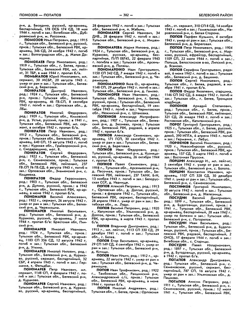 Куренков Виктор Иванович: Электронная книга памяти Тульской области ПОНОМАРЕВ Сергей Иванович, pод.: Тульская обл., Белевский р-н, д. Кураково, русский, кр-армеец, беспаpтийный, 34 СД, 28 февpаля 1942 г. погиб и зах.: Тульская обл., Белевский р-н, д. Фединское. ПОНОМАРЕВ Сергей Иванович, 34 ДИВ., 28 февpаля 1942 г. погиб и зах.: Тульская обл., Белевский р-н,c. Мишенское. ПОНОМАРЕВ Сергей Иванович, pод.: 1915 г., Тульская обл., Богородицкий р-н,Иевлевский с/с, пpизв.: Тульская обл., Богородицкий РВК, рядовой, в июле 1942 г. пропал б/в. ПОНОМАРЕВ Сергей Иванович, pод.: Тульская обл., Белевский р-н,д. Кураково, русский, кр-армеец, беспаpтийный, 28 февpаля 1942 г. погиб и зах.: Тульская обл., Белевский р-н,п. Жабынь. Получается, что под донесение ни один не попадает. Откуда же он взялся, родившийся в Мишенском, служивший в 34 Д (?) и погибший и захороненный в Жабыни? | ||||