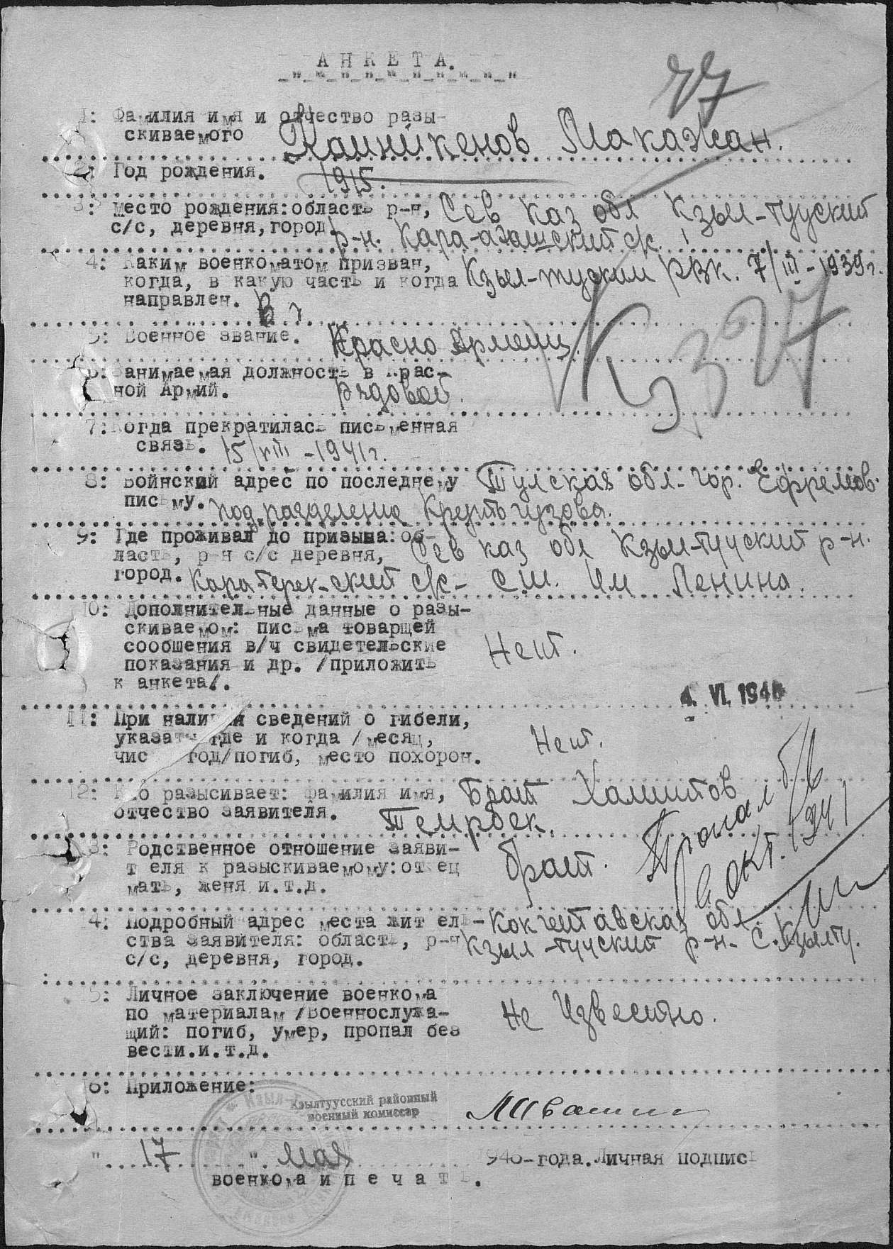Хамитов Берик: Татьяна Вотинцева: Уважаемый Берик! Известно ли вам, как брат вашего отца оказался в Ефремове? Он там проходил срочную службу? Если учесть, что он призван в марте 1939 года, то вполне возможно.В Ефремове находился 388 сп 172 с.д. Но уже в июле 1941 года дивизия воевала в Могилеве. Откуда дата середина августа 1941 года? Если верить анкете, то связь прекратилась 15 августа 1941 года. Не сохранилось ли последнее письмо? Здравствуйте Татьяна! К сожалению к тому что я уже написал пока ничего нового добавить не могу. Письма от Макажана не сохранились. Жду информацию от РВК призыва.Видимо последнее письмо было написано 15 августа 41-го. Остается только надеяться на то, что в военкомате призыва остались сведения о том, куда Макажан был направлен для прохождения службы. По Крутогузову пока ничего не получается. Возможно, он просто был непосредственным командиром. | ||||